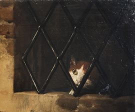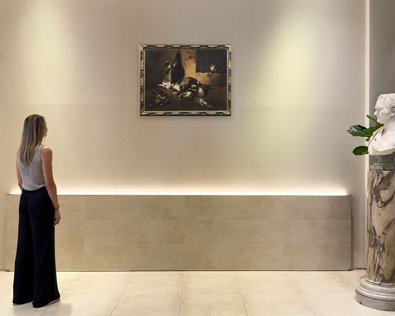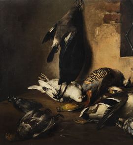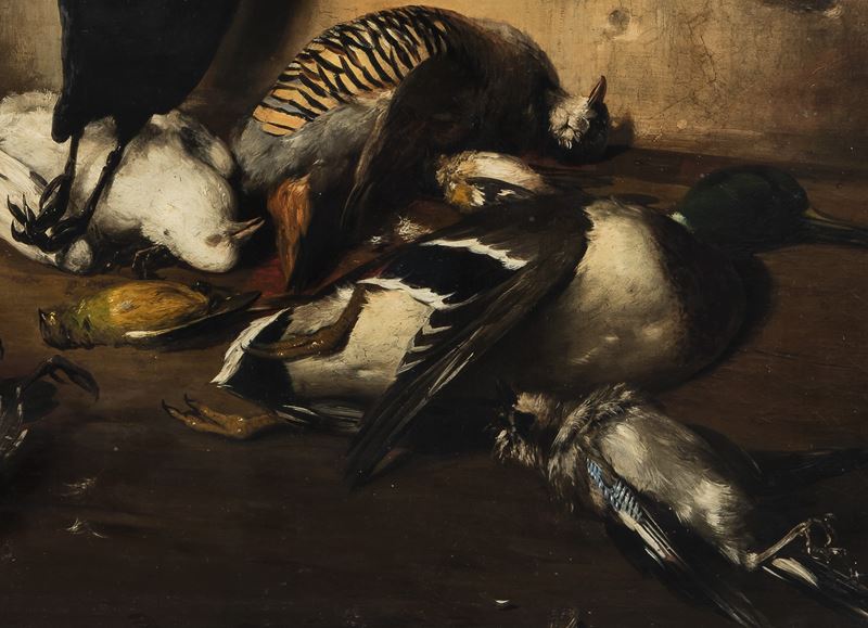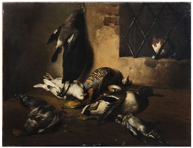Interno di dispensa con selvaggina di penna e gatto