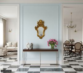 cornice sagomata ornata all'intorno da ghirlande fiorite e fruttate a centrare la cimasa che culmina in una testa di putto, alla base volute e un piccolo mascherone