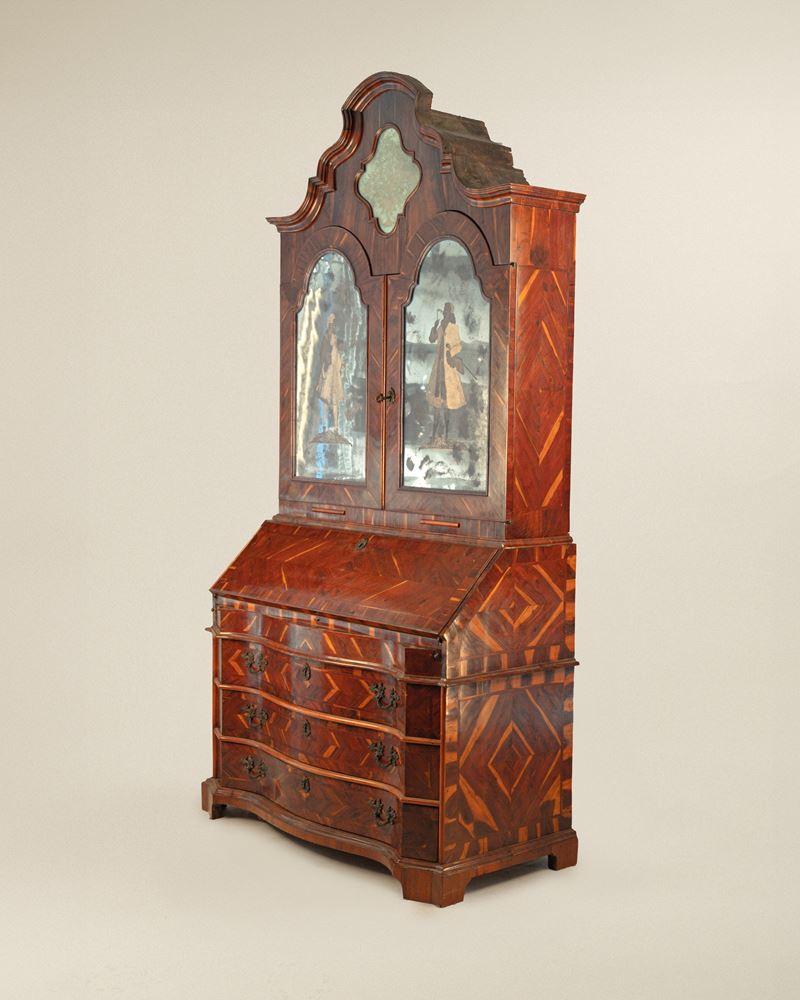 parte superiore a due ante con specchi molati a figure settecentesche, nella cimasa a timpano uno specchio sagomato. Nella parte inferiore la calatoia cela all'interno otto cassetti e un vano, fronte mistilineo a tre cassetti separati da traverse, piedi a mensola