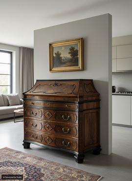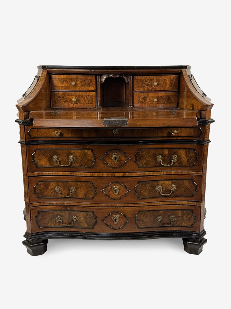 Cassettone a ribalta lastronata in noce e radica di noce, Lombardia, metà del XVIII secolo