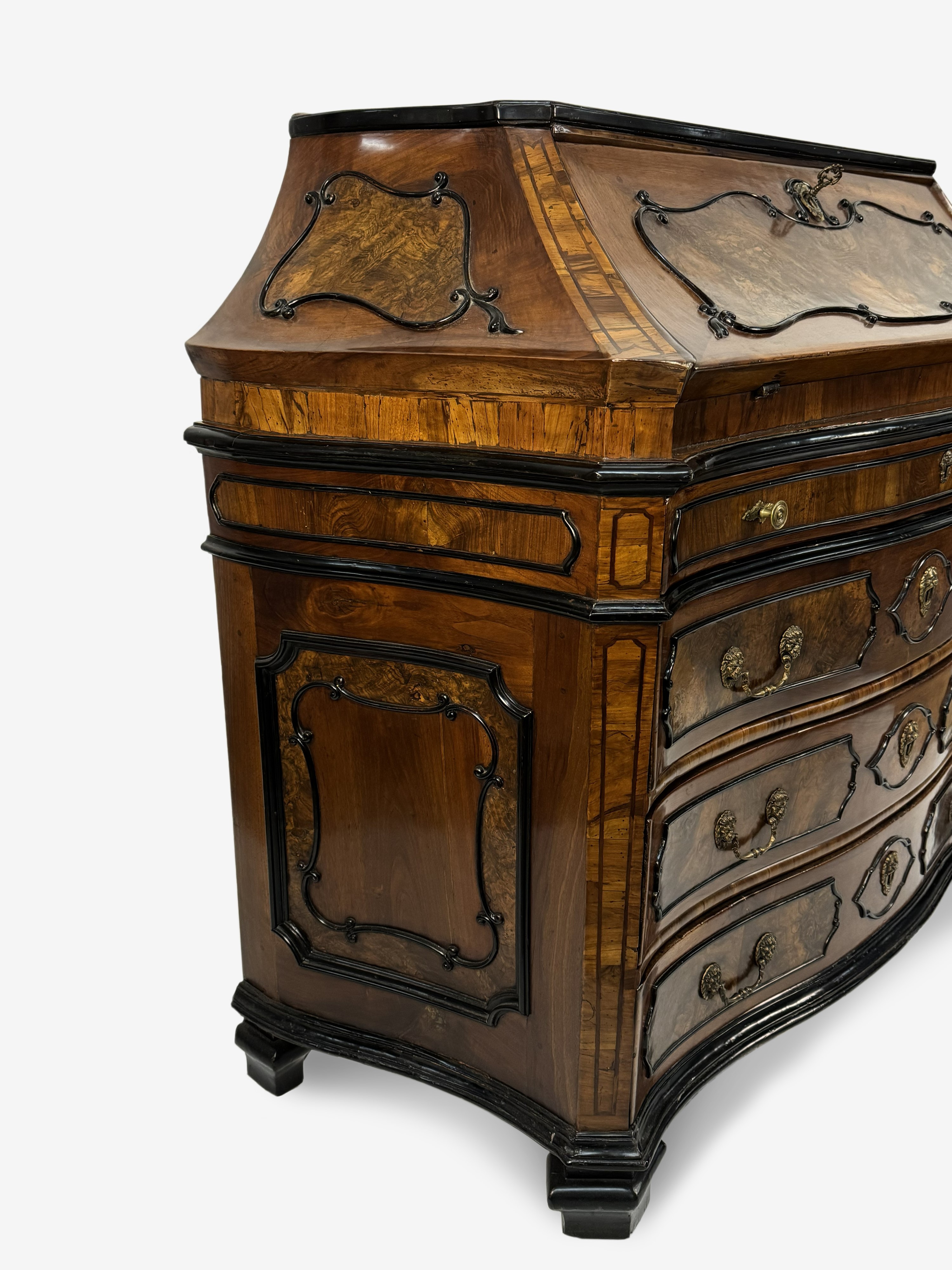 corpo mosso decorato con cornici in legno ebanizzato, fronte a tre cassetti separati da traverse e sormontati da uno più piccolo sotto la calatoia, nella calatoia si celano quattro cassetti, un vano e un segreto, piedi a mensola