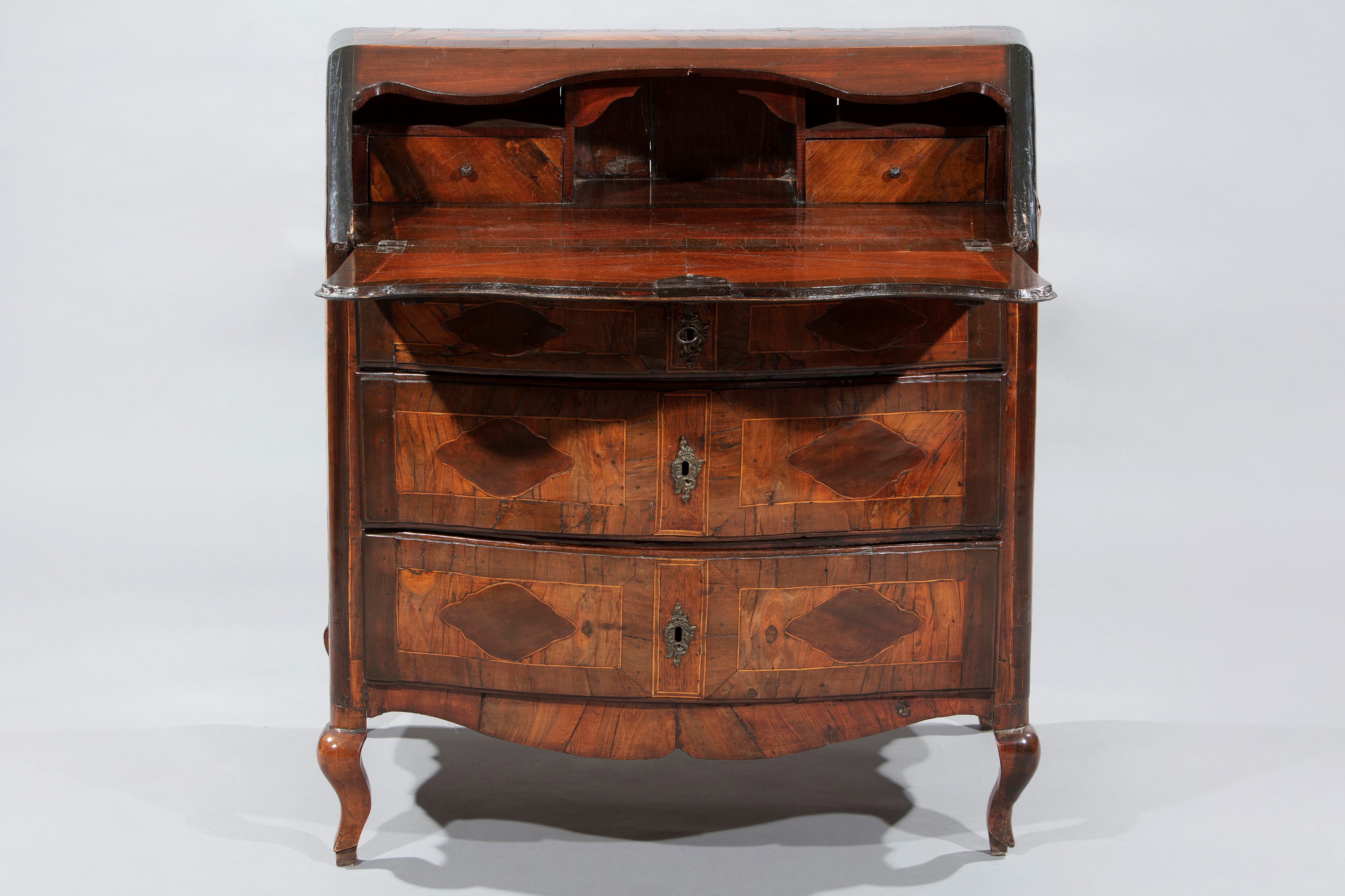fronte bombato a tre cassetti decorati da riserve mistilinee entro pannelli. Nella calatoia due cassetti e tre vani. Grembiale sagomato e fianchi dritti intarsiati con decoro simile al fronte. Gambe mosse. Difetti e restauri.