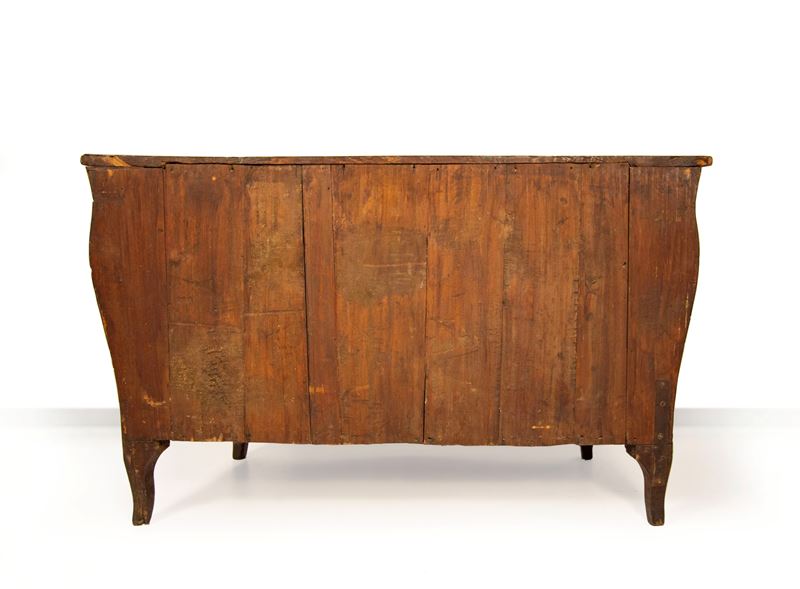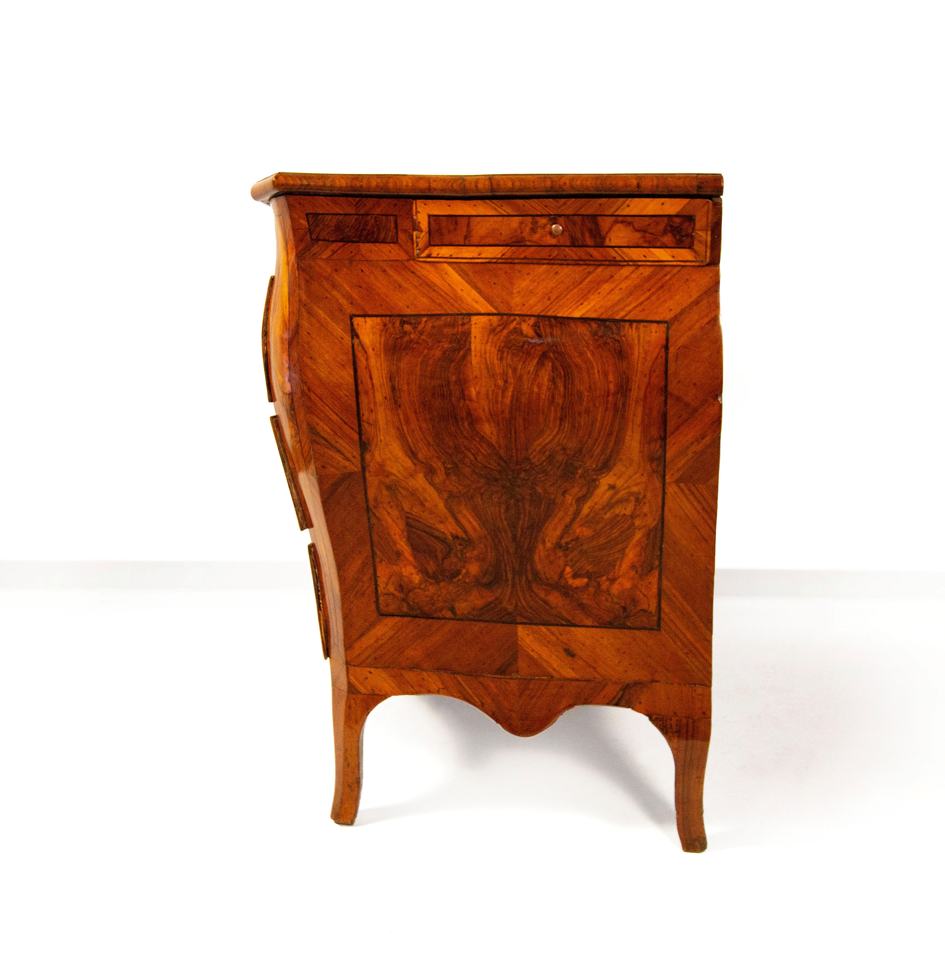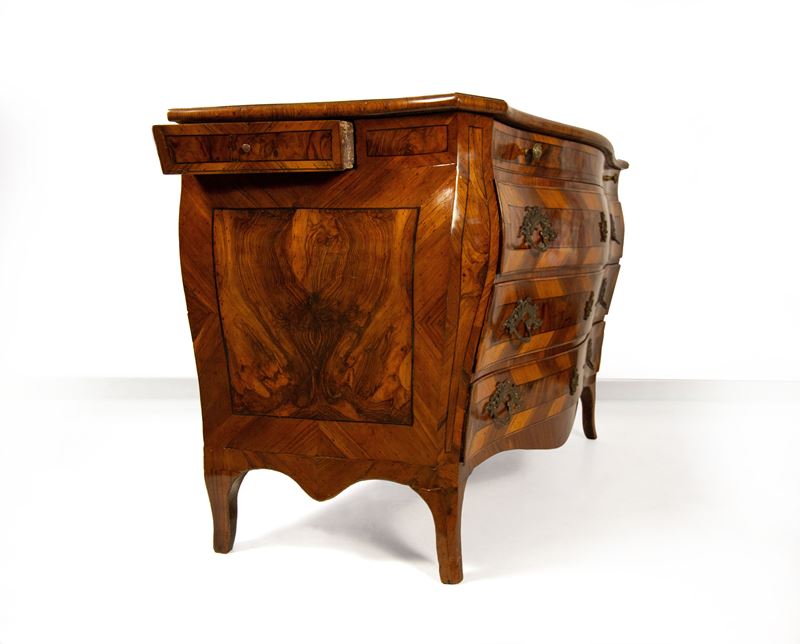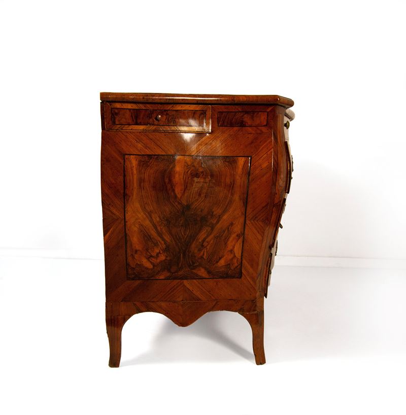 corpo mosso, fronte lievemente bombata a tre cassetti separati da traversa e sormontati da uno piccolo sotto il piano. Lesene laterali pronunciate; sui fianchi due piccoli cassetti sotto piano; grembiale sagomato e piedi mossi