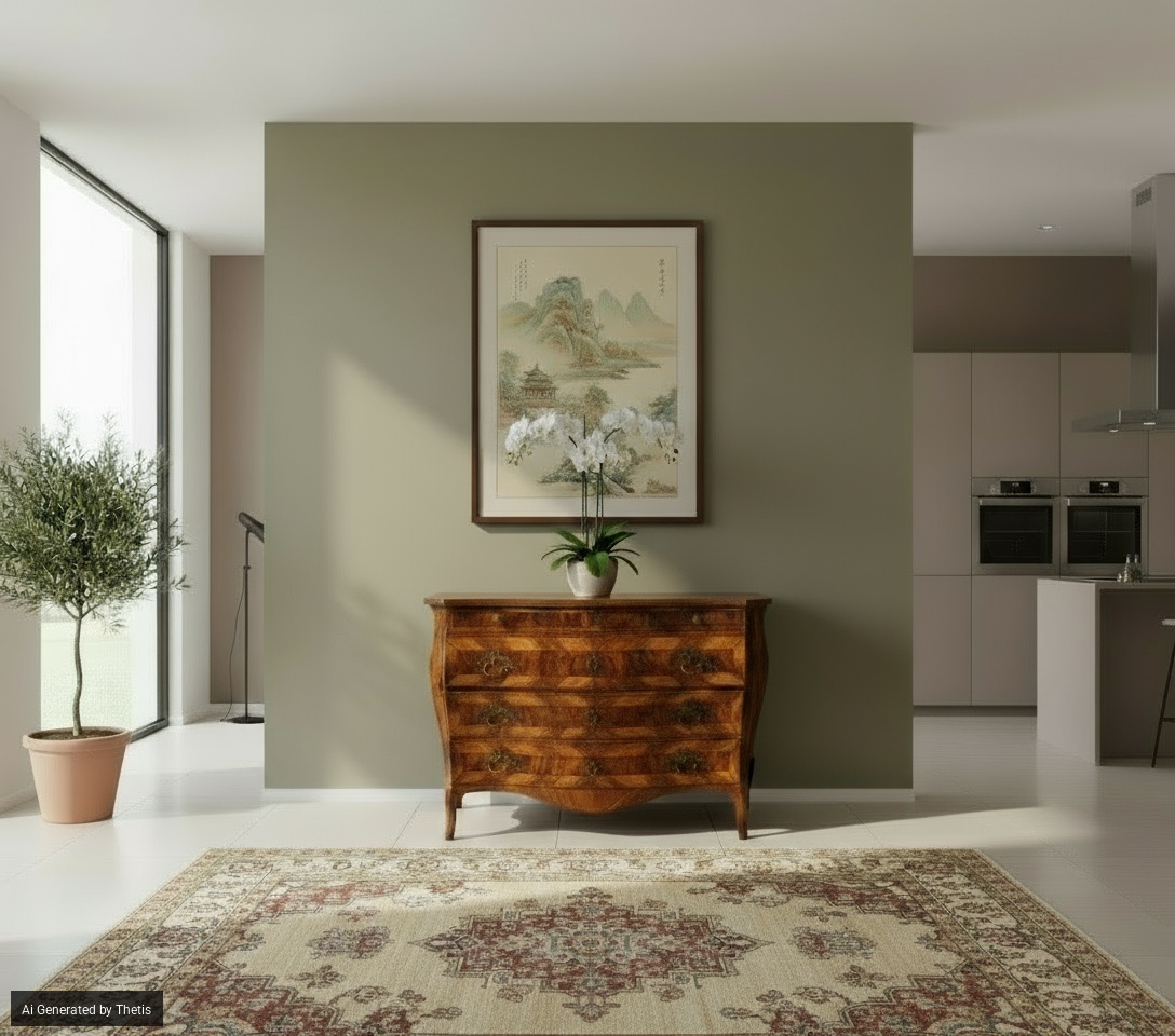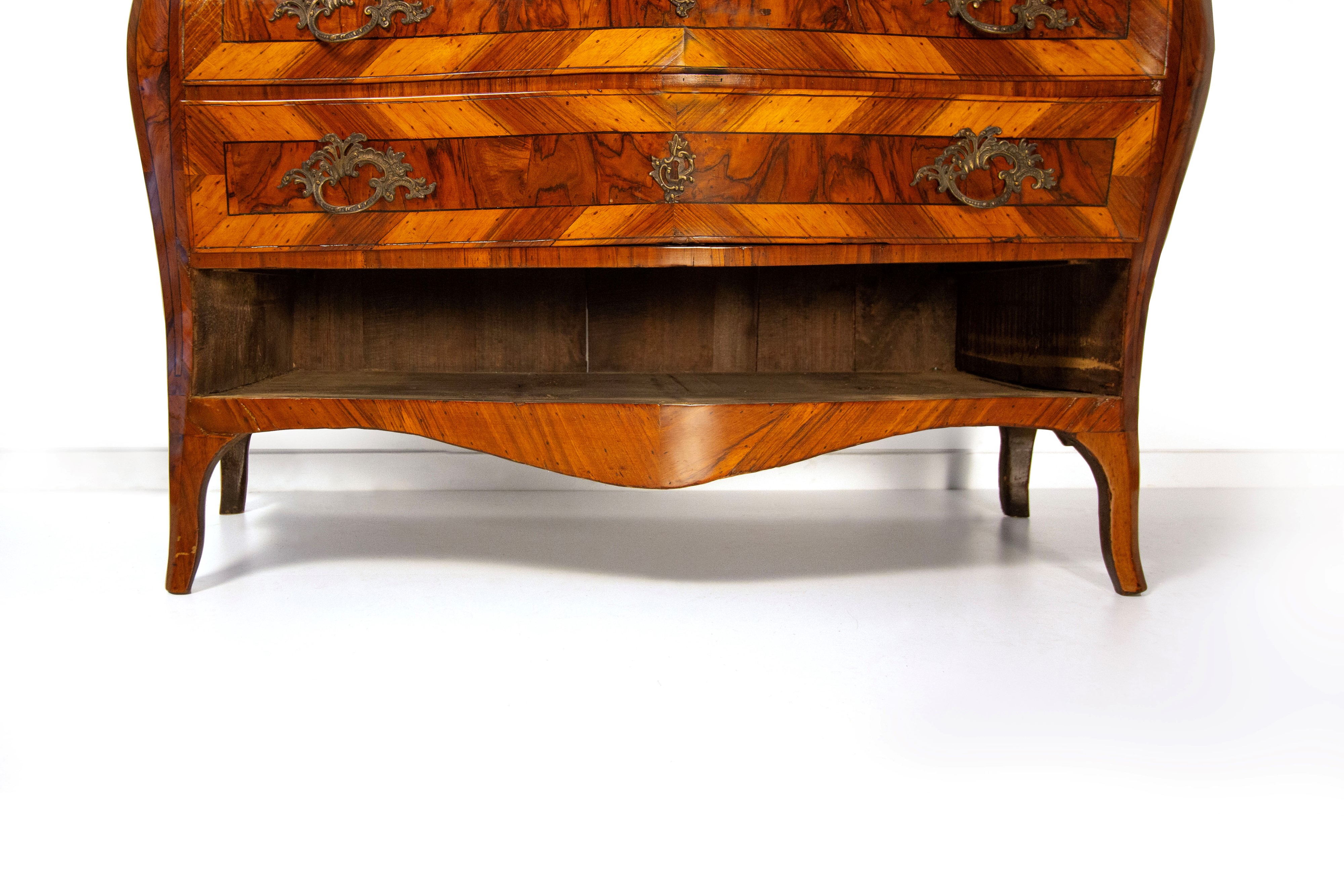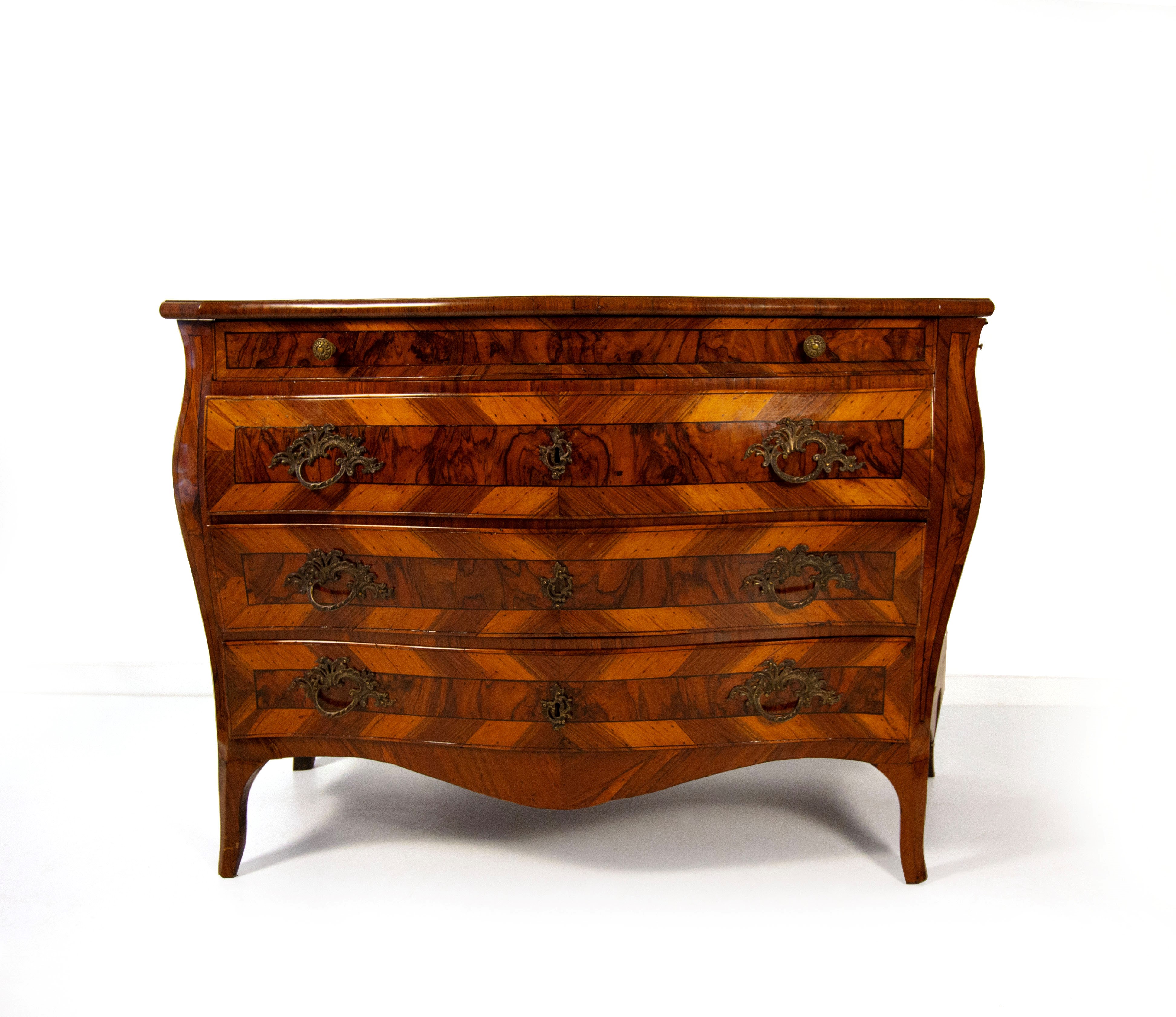corpo mosso, fronte lievemente bombata a tre cassetti separati da traversa e sormontati da uno piccolo sotto il piano. Lesene laterali pronunciate; sui fianchi due piccoli cassetti sotto piano; grembiale sagomato e piedi mossi