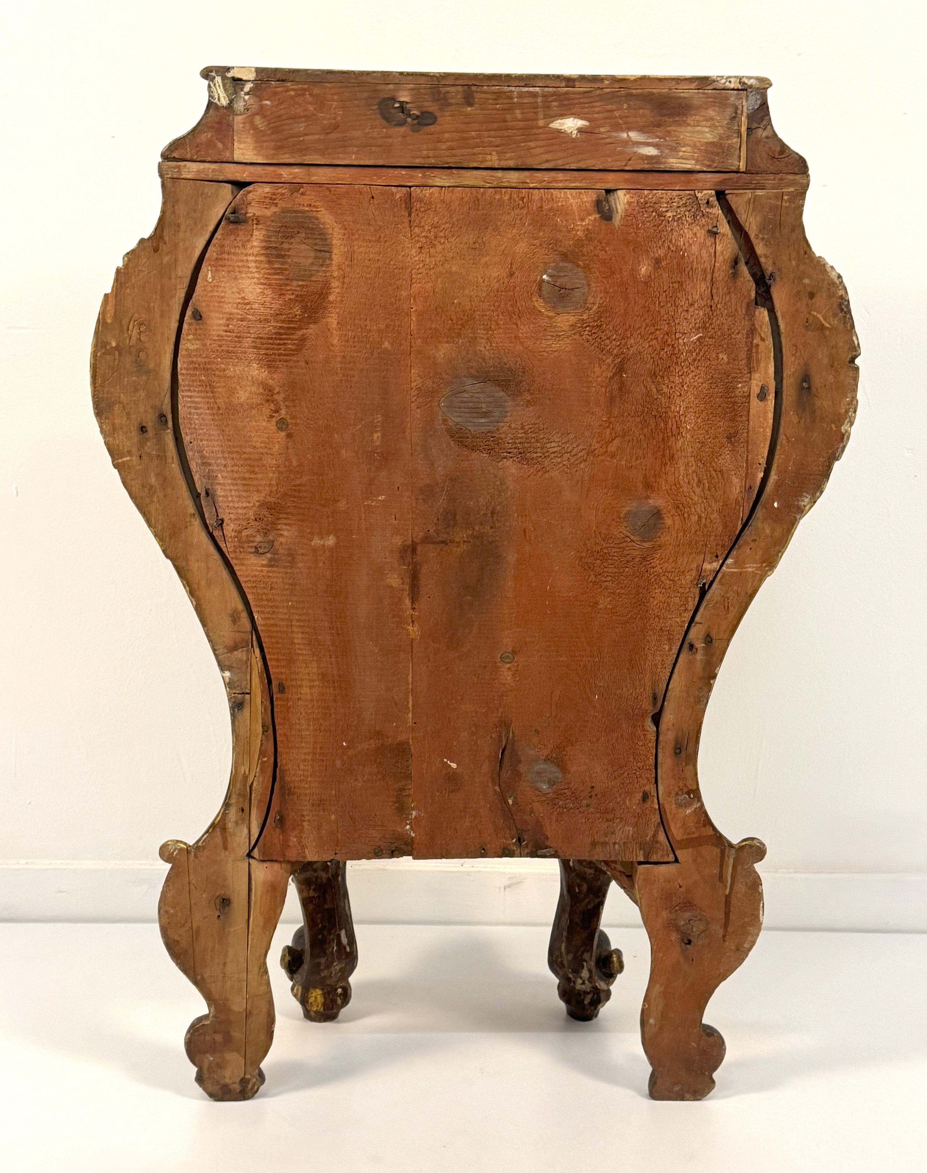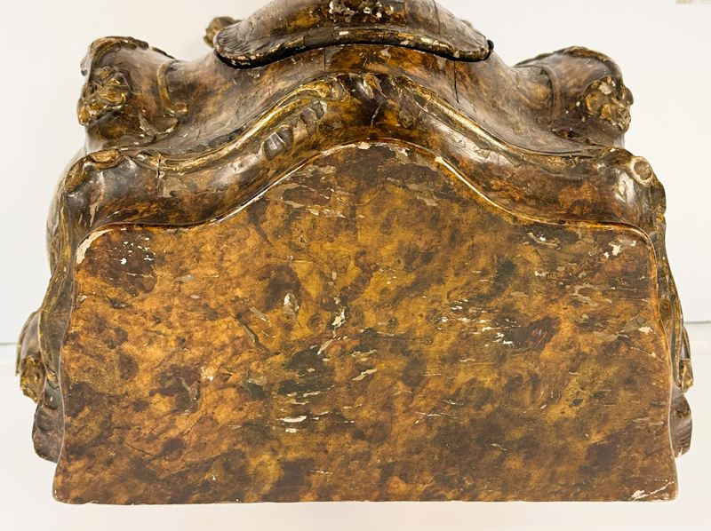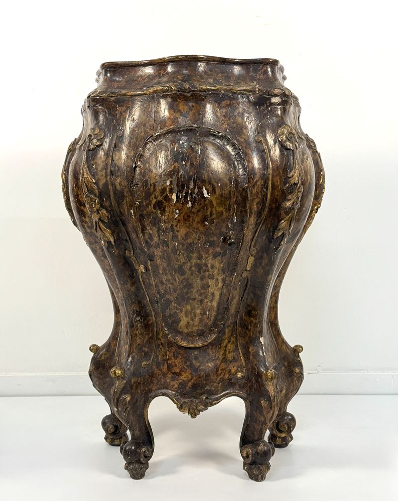 Corpo fortemente sagomato interamente decorato a simulare un effetto tartarugato, sul fronte un'anta e sugli angoli decori a rilievo dorati a piccoli tralci con fiori e foglie ed elementi rocailles, piedi mossi terminanti a ricciolo
