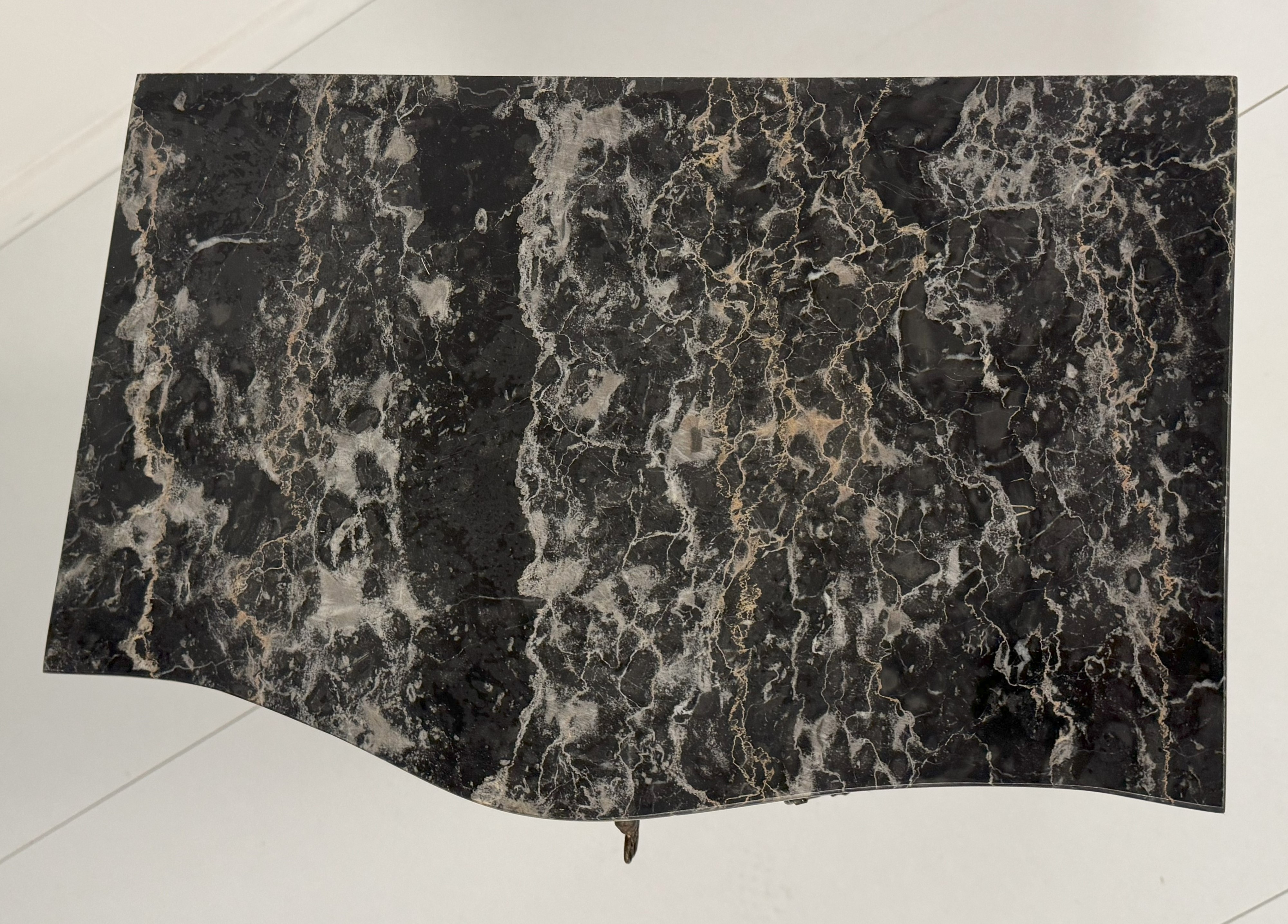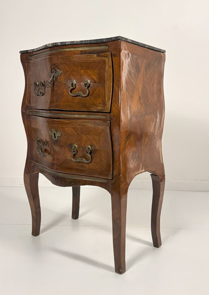 corpo mosso sia sul fronte che sui fianchi, fronte a due cassetti separati da traverse sottolineati da una linea incava dorata e decorati da un intarsio a "marquetterie", fianchi ornati da pannelli a spina di pesce a creare un decoro romboidale, gambe mosse