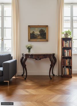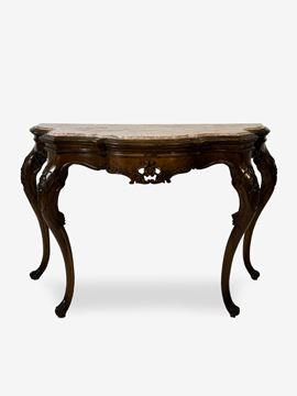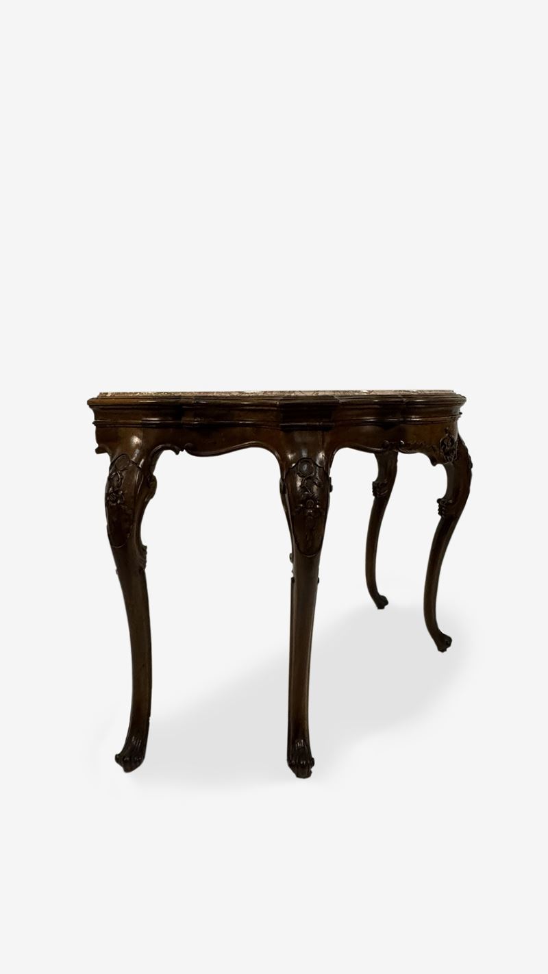 Console in noce, Veneto, XVIII secolo, cintura mistilinea, con fronte intagliato a leggeri motivi rocailles a centrare un motivo floreale, gambe arcuate con attacco scolpito a cartiglio centrato da un fiore, piedi a ricciolo, piano in marmo venato rosa, cm 77,5x113x56