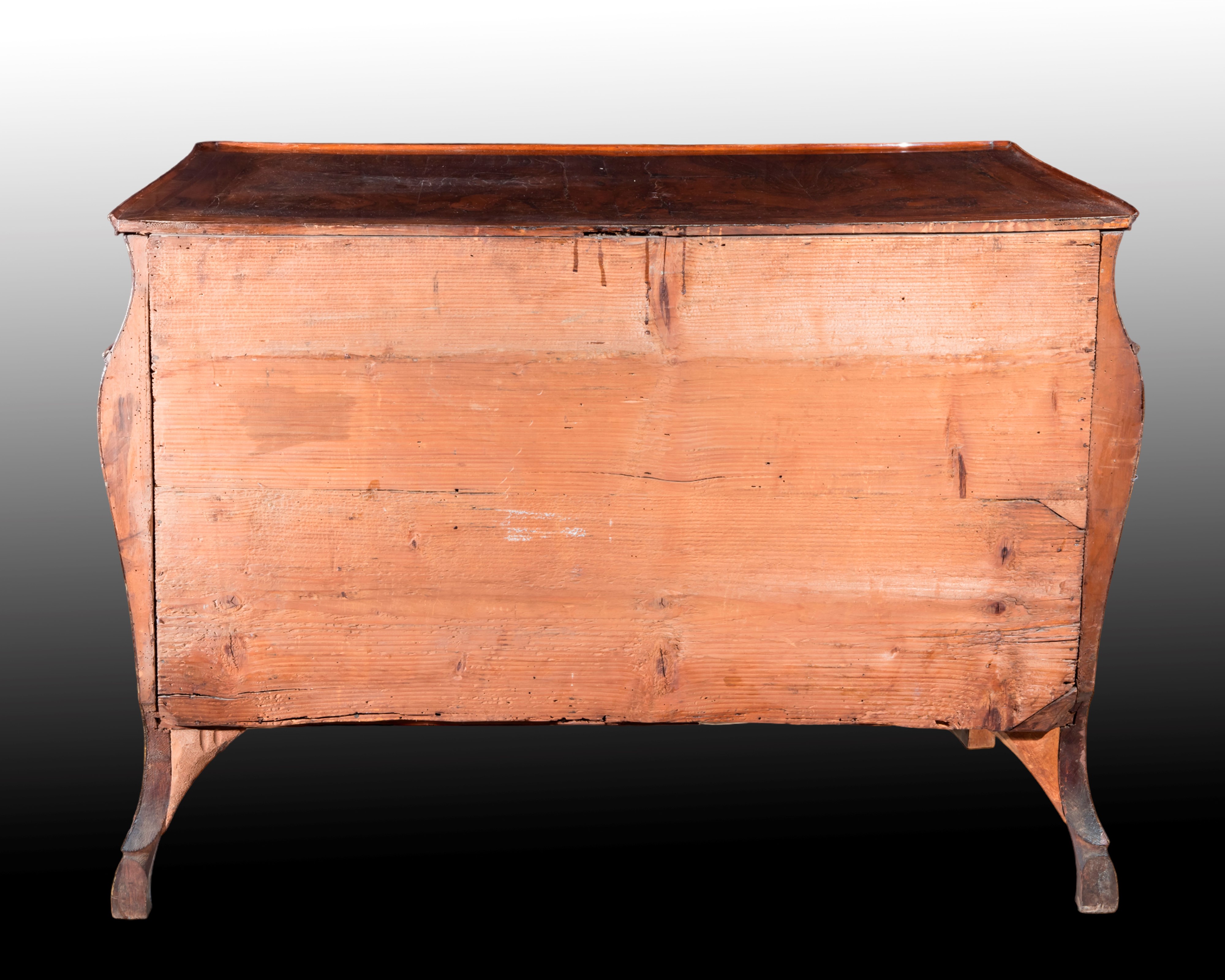 fronte a tre cassetti senza traverse, grembiale mosso, gambe leggermente mosse e piedini a zoccolo caprino.