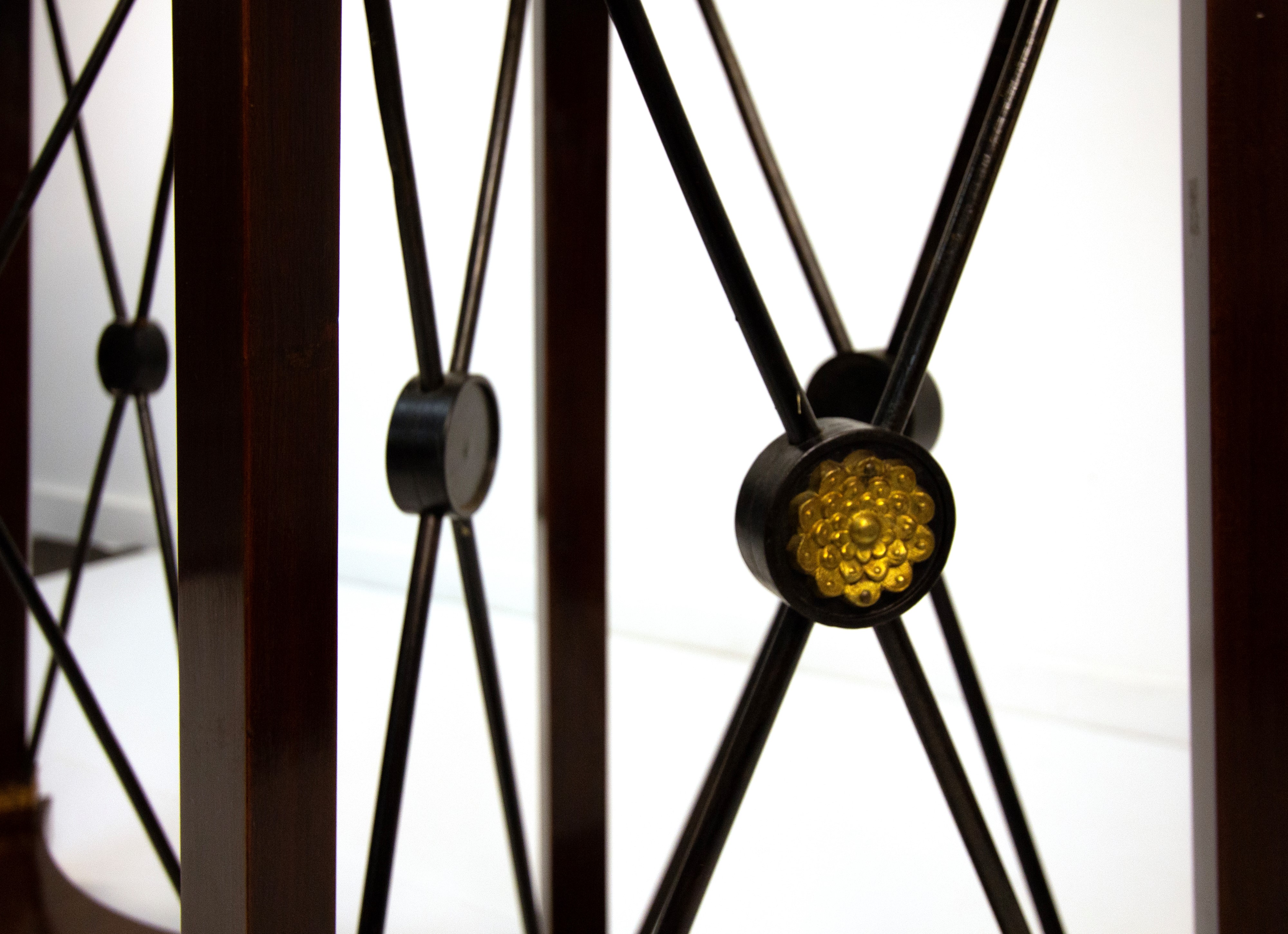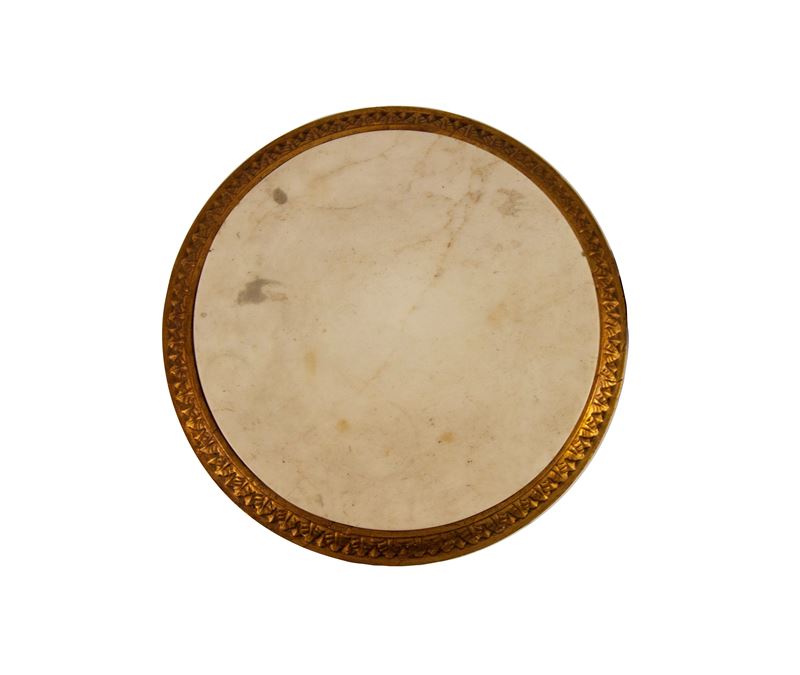 piano circolare in marmo bianco con ciglio dorato a palmette su cintura diritta; montanti quadrangolari con attacco ad erma muliebre dorata, sottili traverse a X centrate da rosetta e piano di base su piedi a zampa leonina