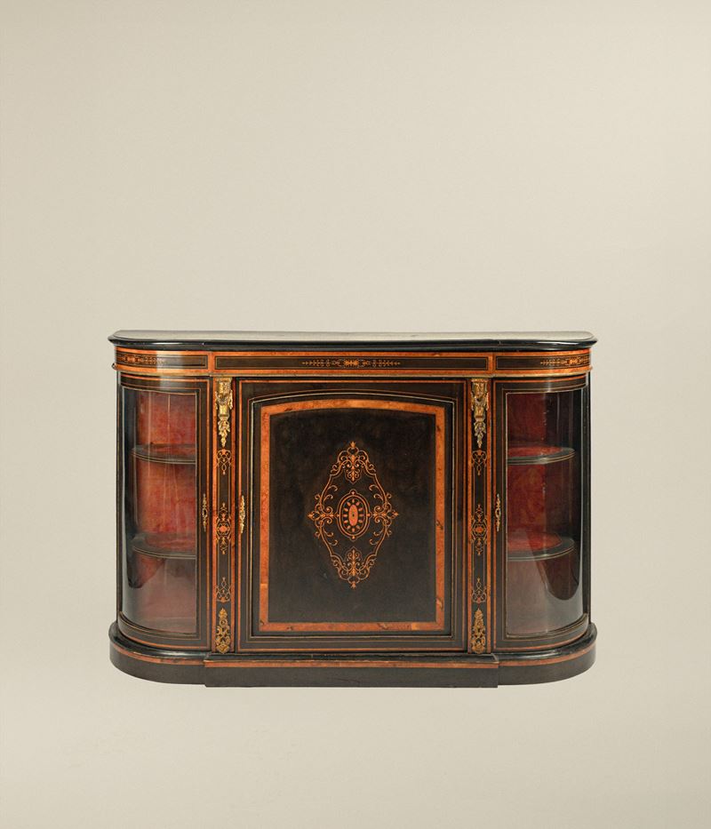 Credenza in legno ebanizzato e intarsiata in legni diversi, Inghilterra, XIX secolo