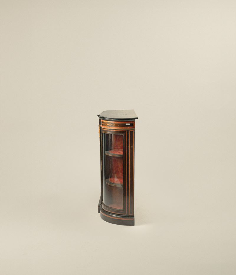 corpo stondato con ante laterali a vetri e anta centrale con medaglione intarsiato a fitti girali che si ripetono sulle lesene ornate da fregi in bronzo dorato.