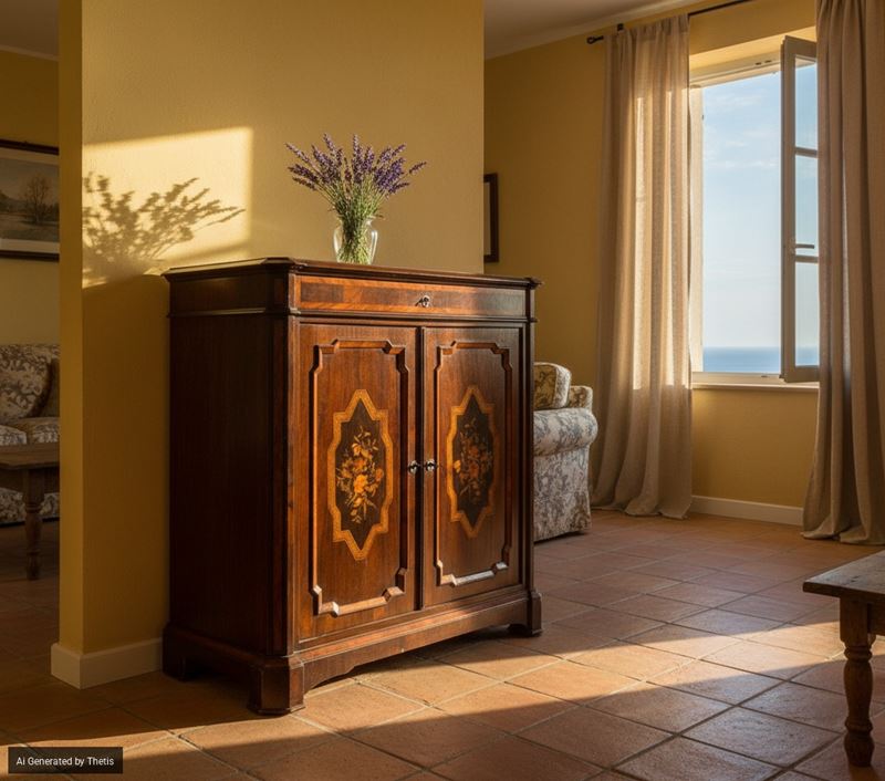 Credenza lastronata e intarsiata in legni diversi, XIX secolo