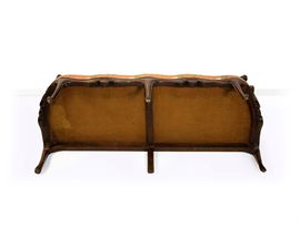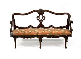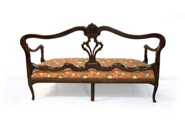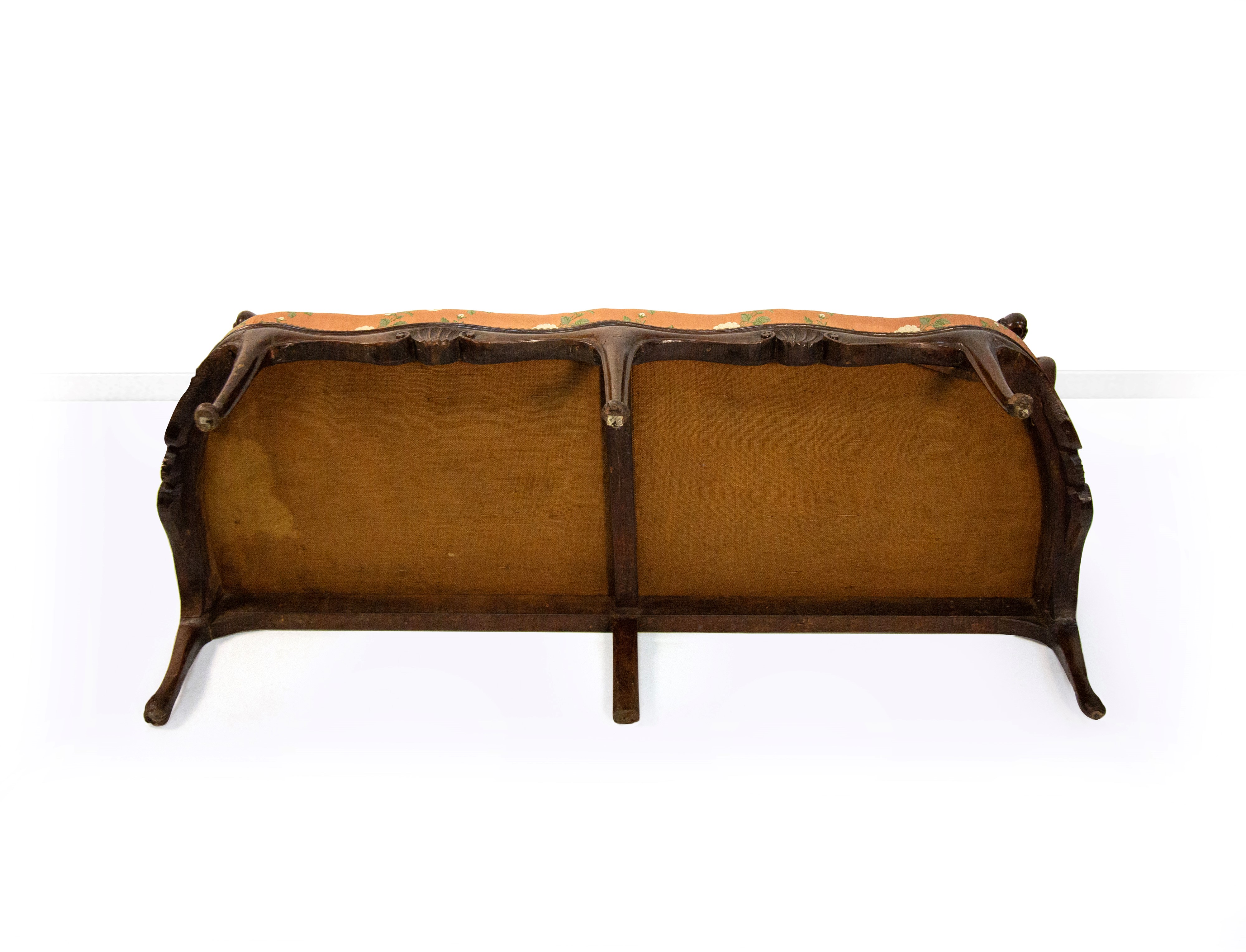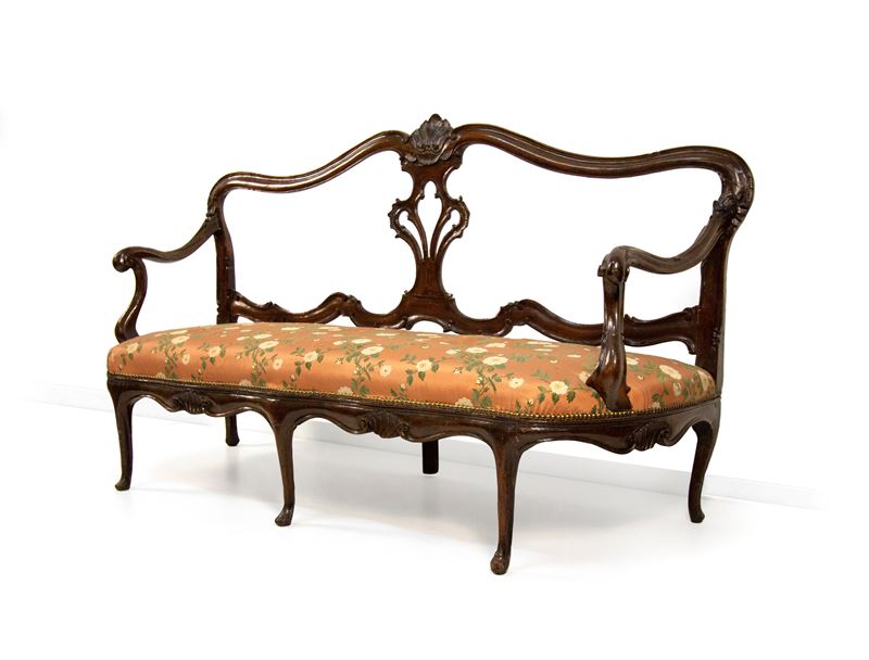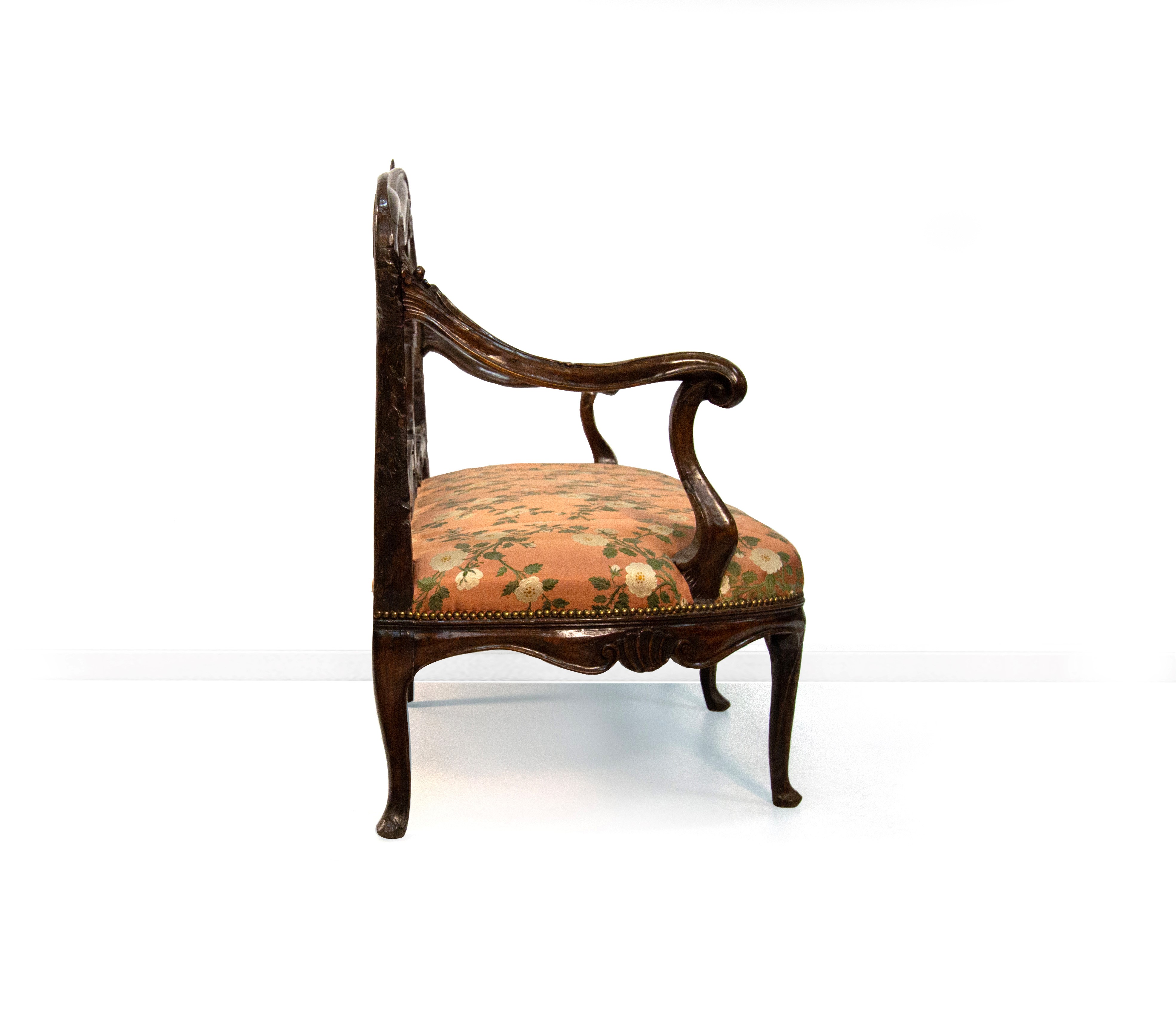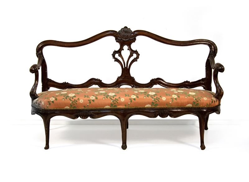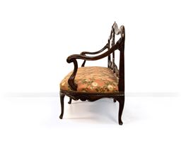 schienale a giorno a profilo sagomato centrato da una cartella intagliata; braccioli su montanti mossi, cintura a volute e gambe leggermente arcuate. Sedile imbottito e rivestito in tessuto a fiori su fondo rosa
