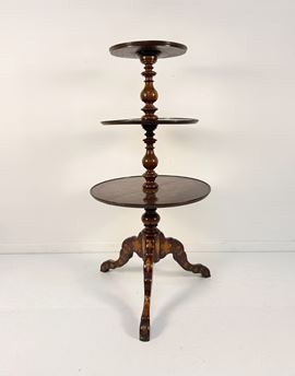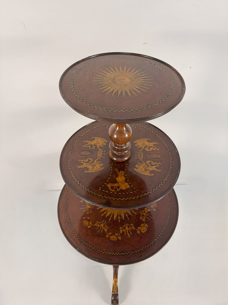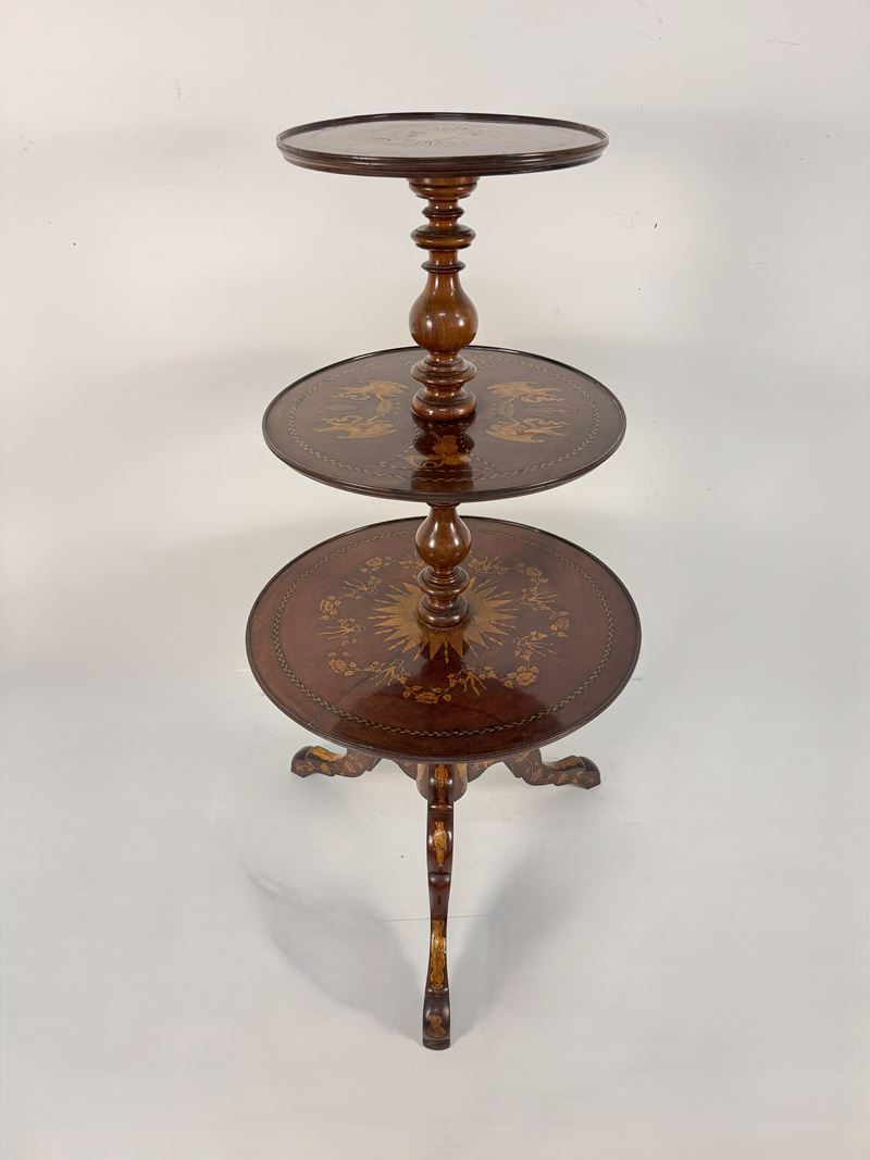 tre ripiani circolari degradanti, decorati da intarsi raffiguranti ghirlande, angeli e un sole raggiante, montante centrale tornito e base tripode