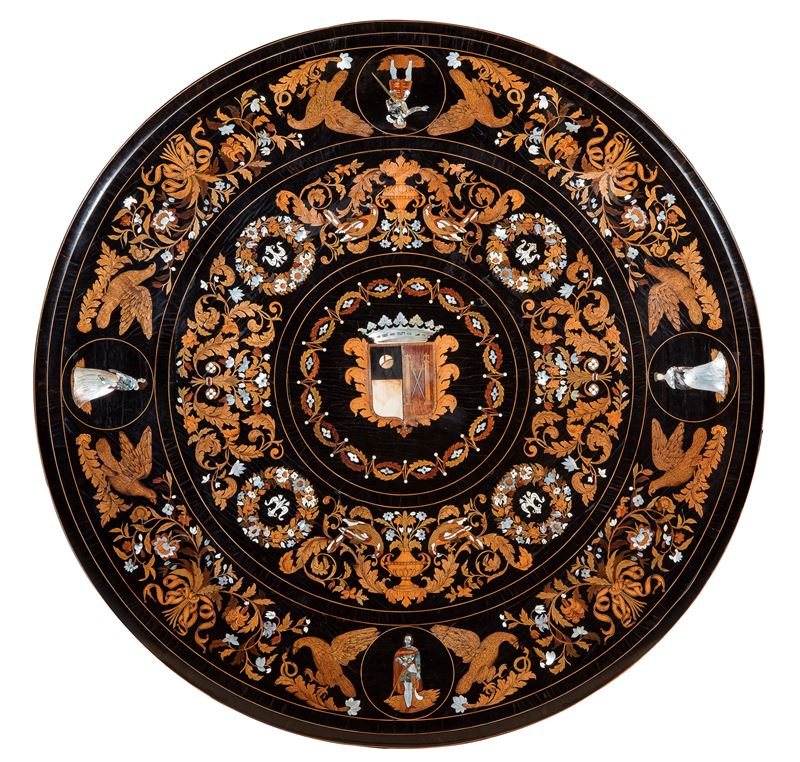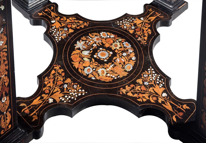 Il piano di forma sagomata poggia su quattro gambe scanalate e collegate da una traversa centinata. La superficie e le fasce sono impiallacciate in ebano e intarsiate con legni policromi, madreperla e avorio, in un complesso disegno ornamentale che alterna motivi floreali, festoni e riserve geometriche.
