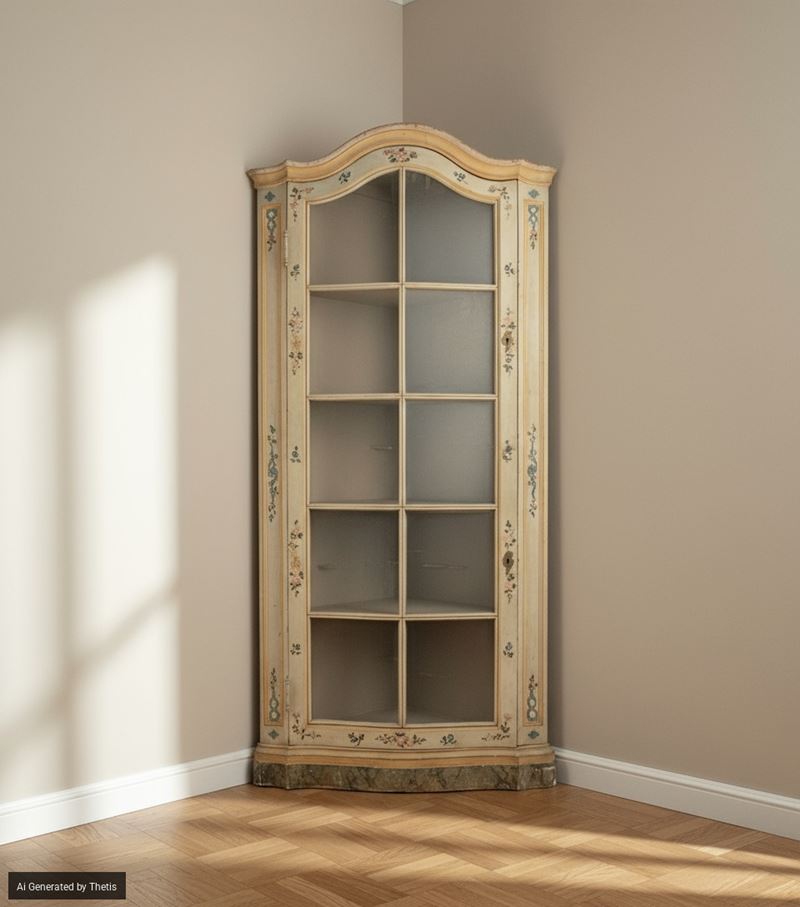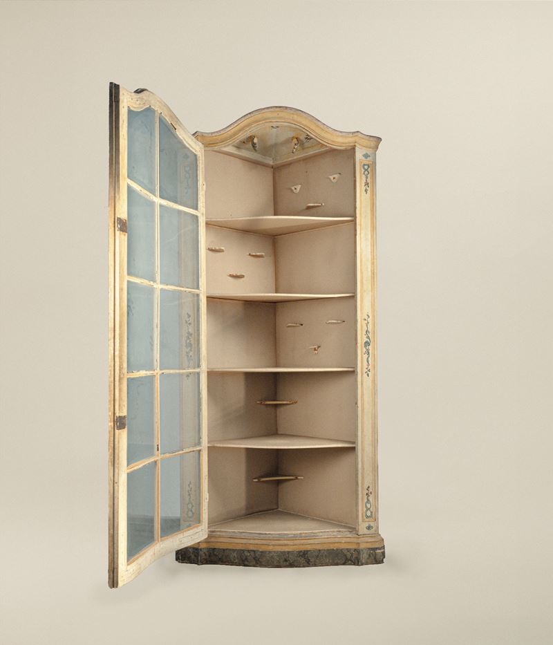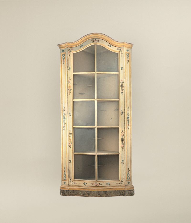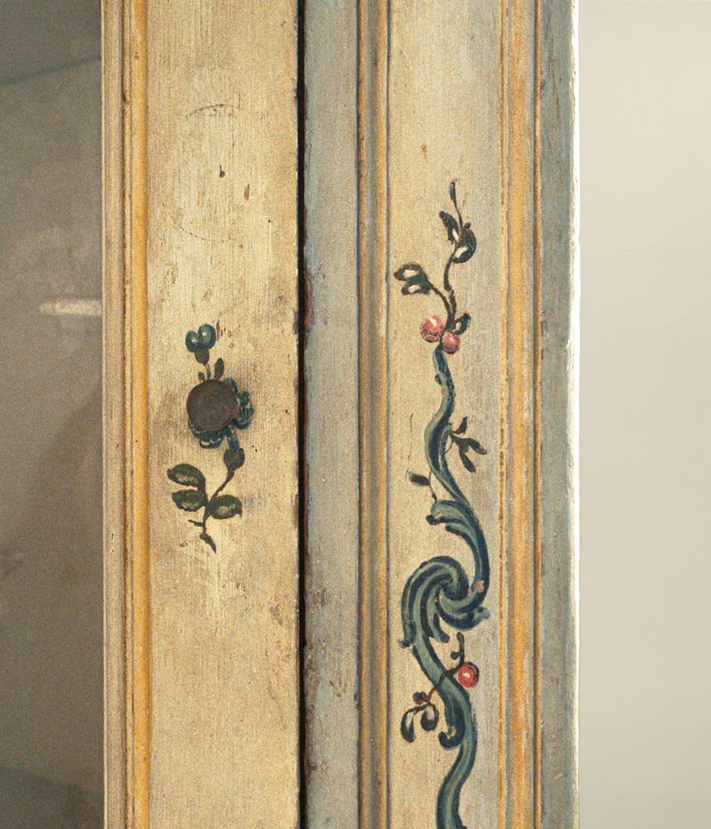 interamente decorata a piccoli fiori su fondo avorio, fronte leggermente bombato con un anta a vetri quadrettata, cimasa modanata e stondata, fascia di base decorata finto marmo, (laccatura non coeva).