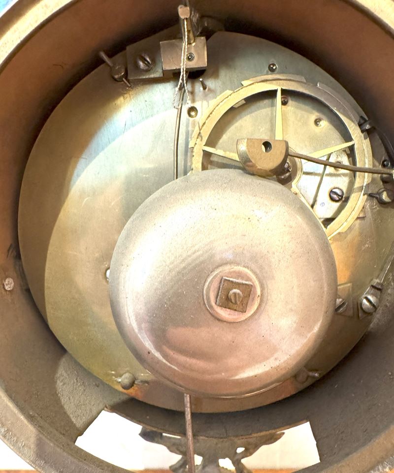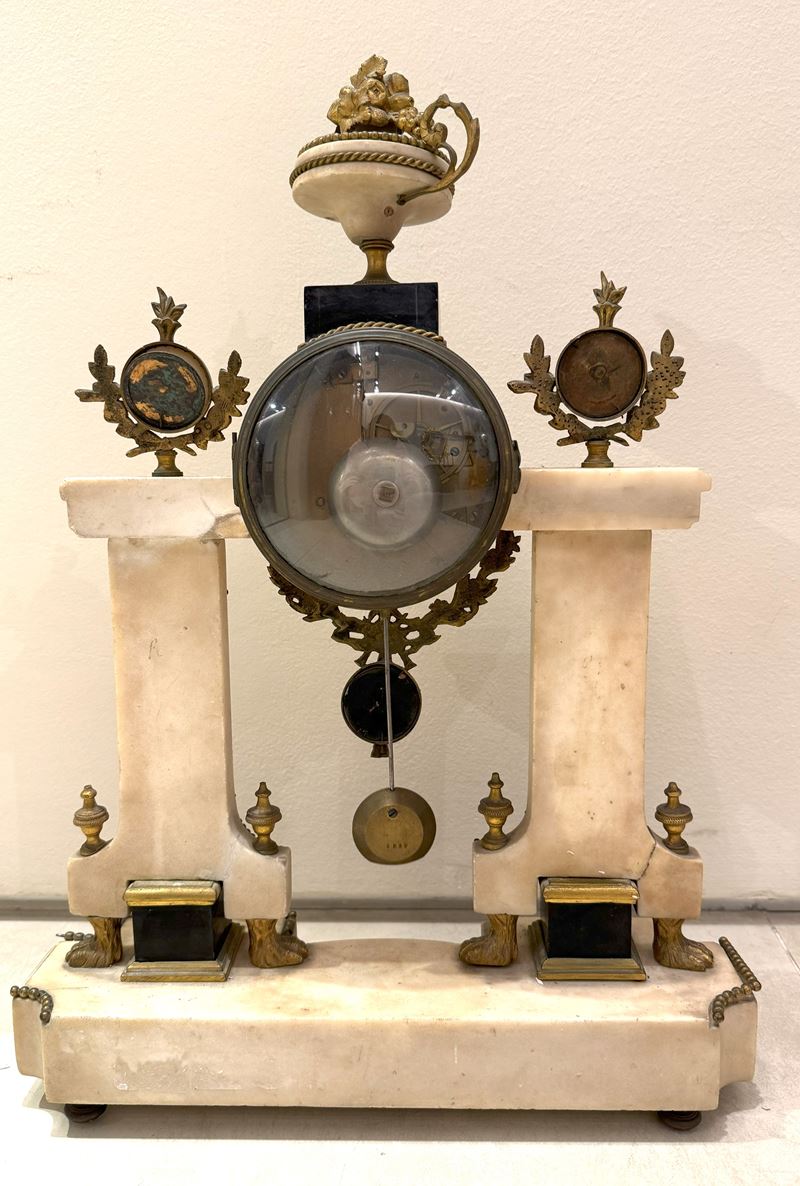 cassa in marmo bianco, marmo nero e bronzo dorato, quadrante firmato "Cellier a Paris" con numerazione araba per le ore e i quarti