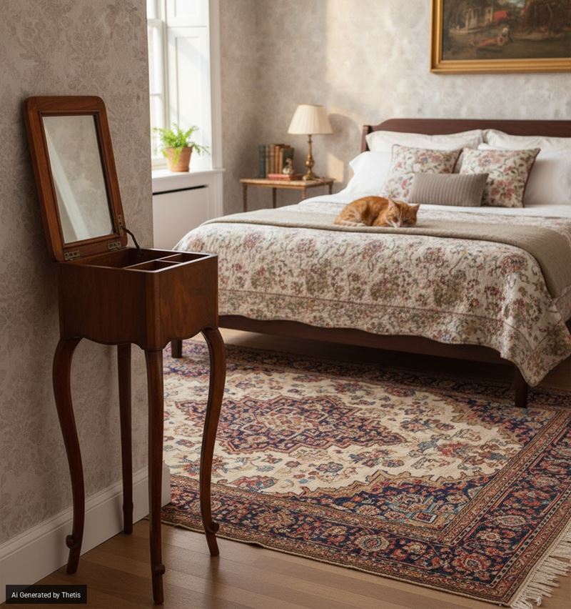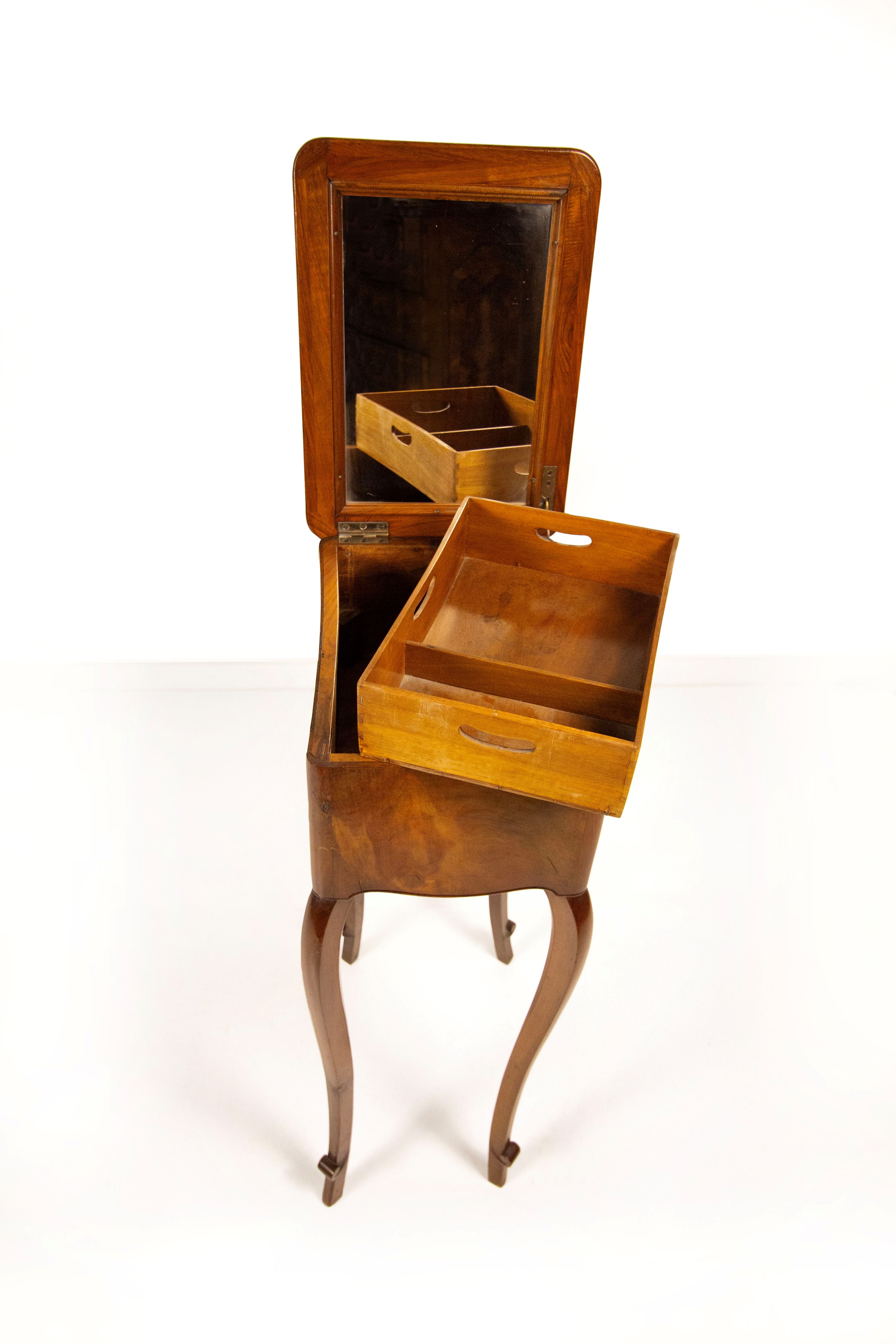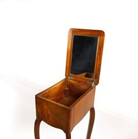 il piano sollevabile cela al retro uno specchio e all'interno un vano a due scomparti estraibile, alte gambe arcuate terminanti a piccolo ricciolo