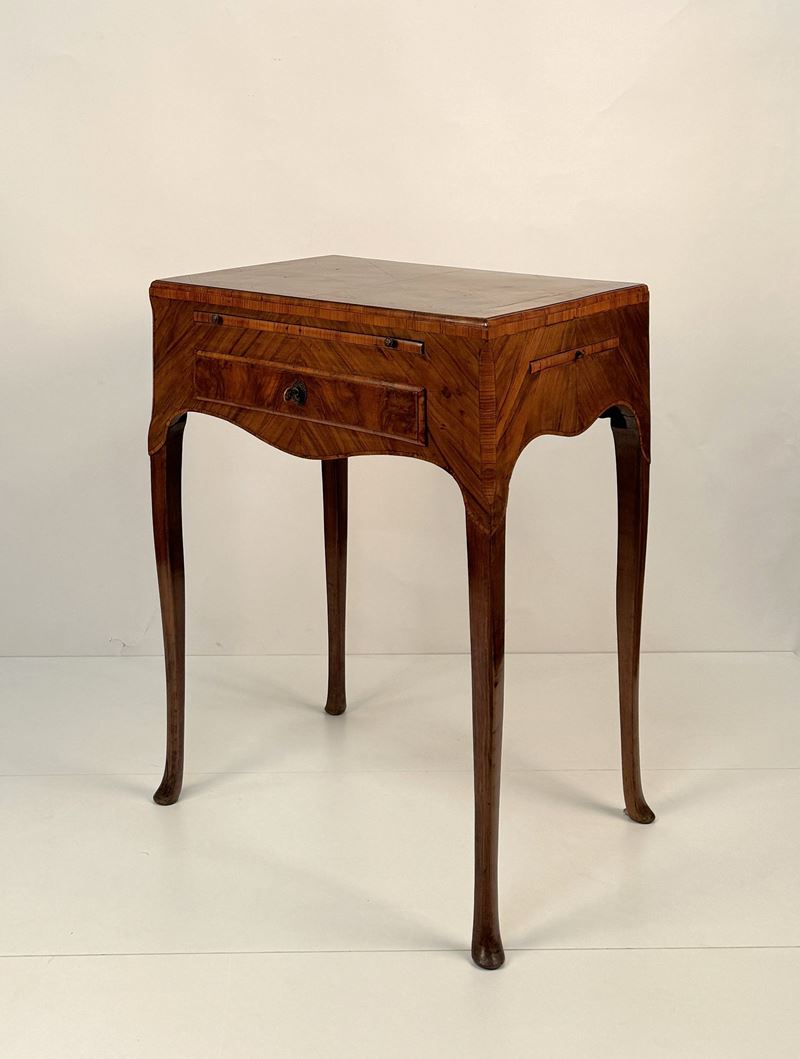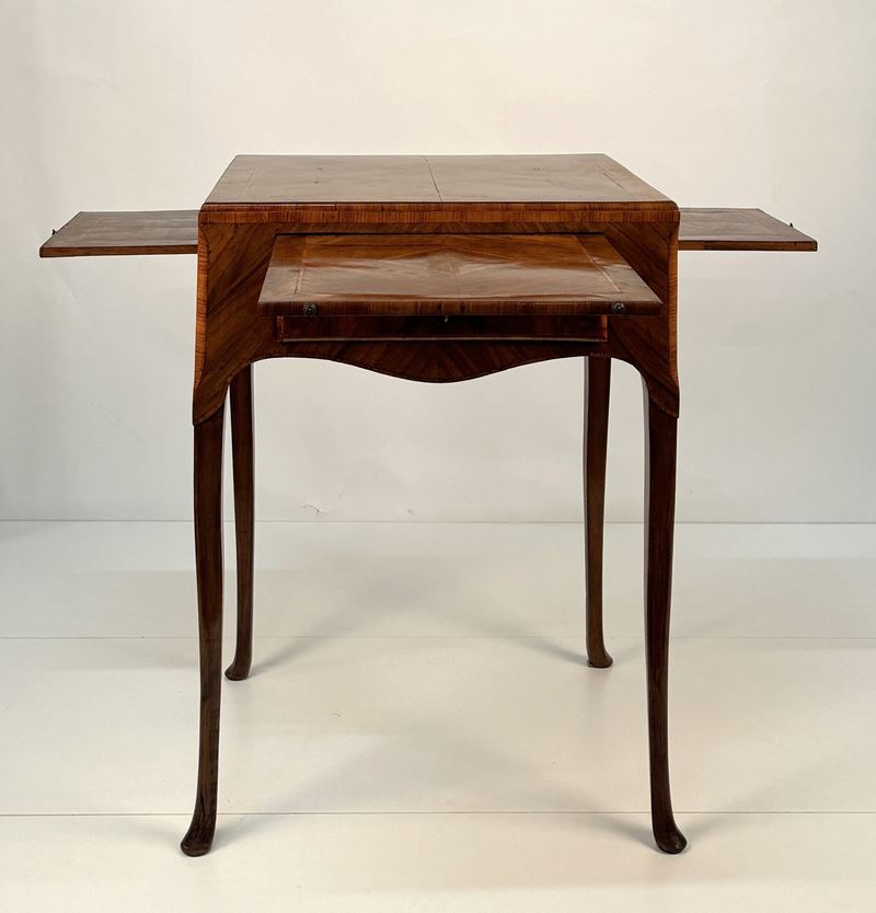 decorato da pannelli a spina di pesce, sui tre lati, nella cintura un piano estraibile e sul fronte un cassetto.