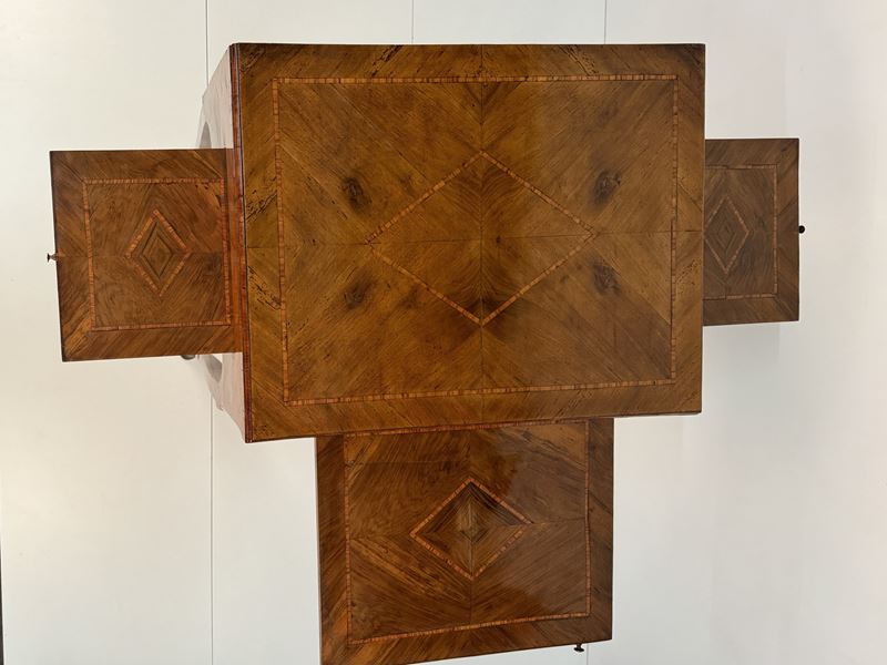 I piano sono decorati da un 'intarsio a rombo entro una sottile cornice, gambe leggermente arcuate terminanti a zoccolo.