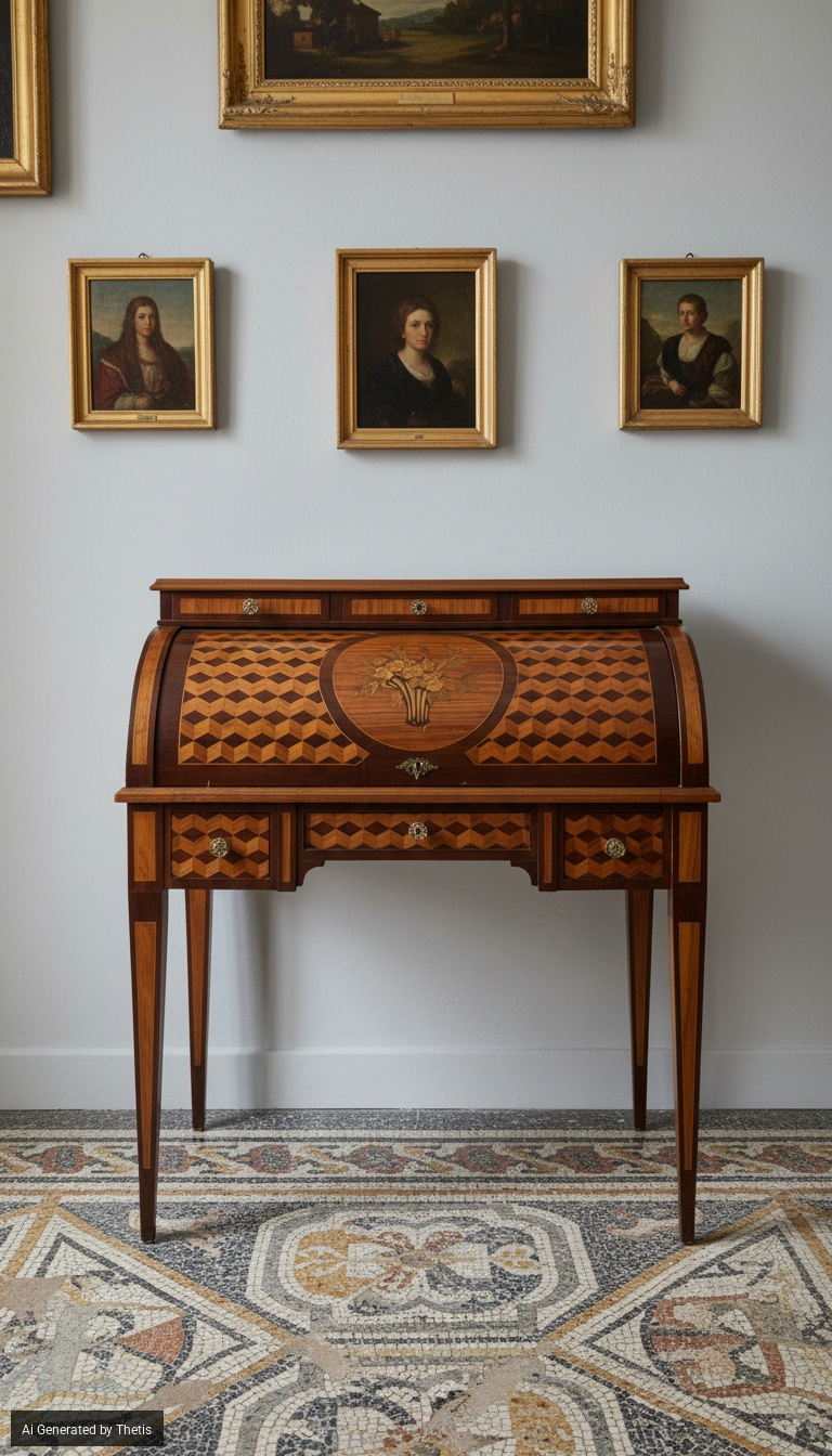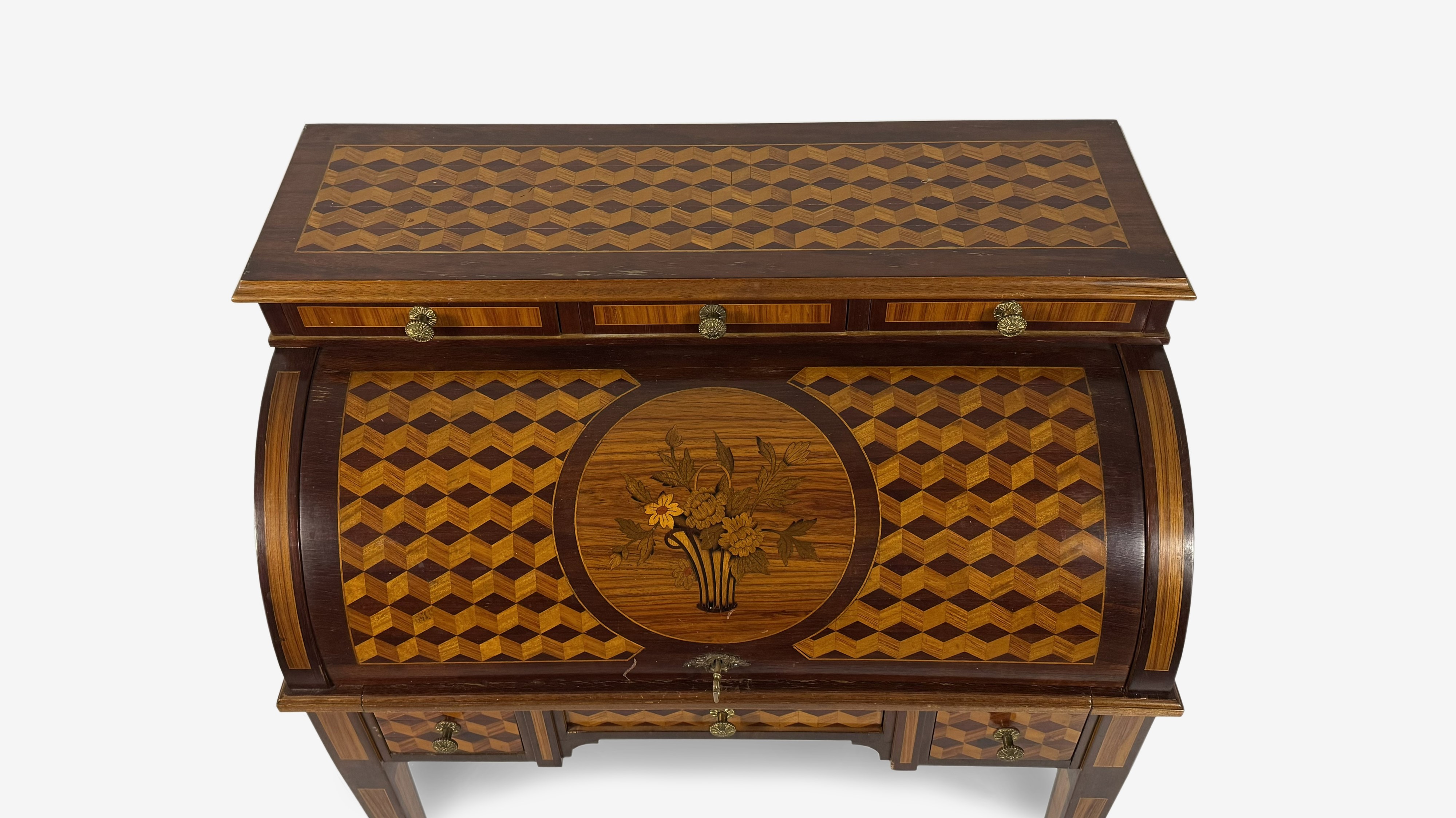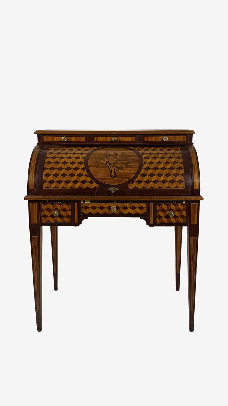 Scrivania a rullo da centro impiallacciata in legni vari, Francia, XX secolo