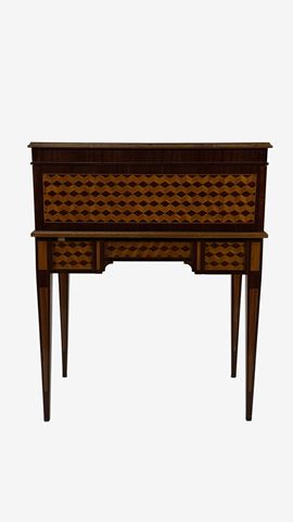 in stile Luigi XVI, corpo decorato a marqueterie, nella cintura tre cassetti, sulla calatoia un medaglione raffigurante un vaso di fiori e all'interno quattro vani e tre cassetti, piano scorrevole rivestito in pelle bordeaux, la piccola alzata presenta tre cassetti in linea