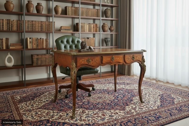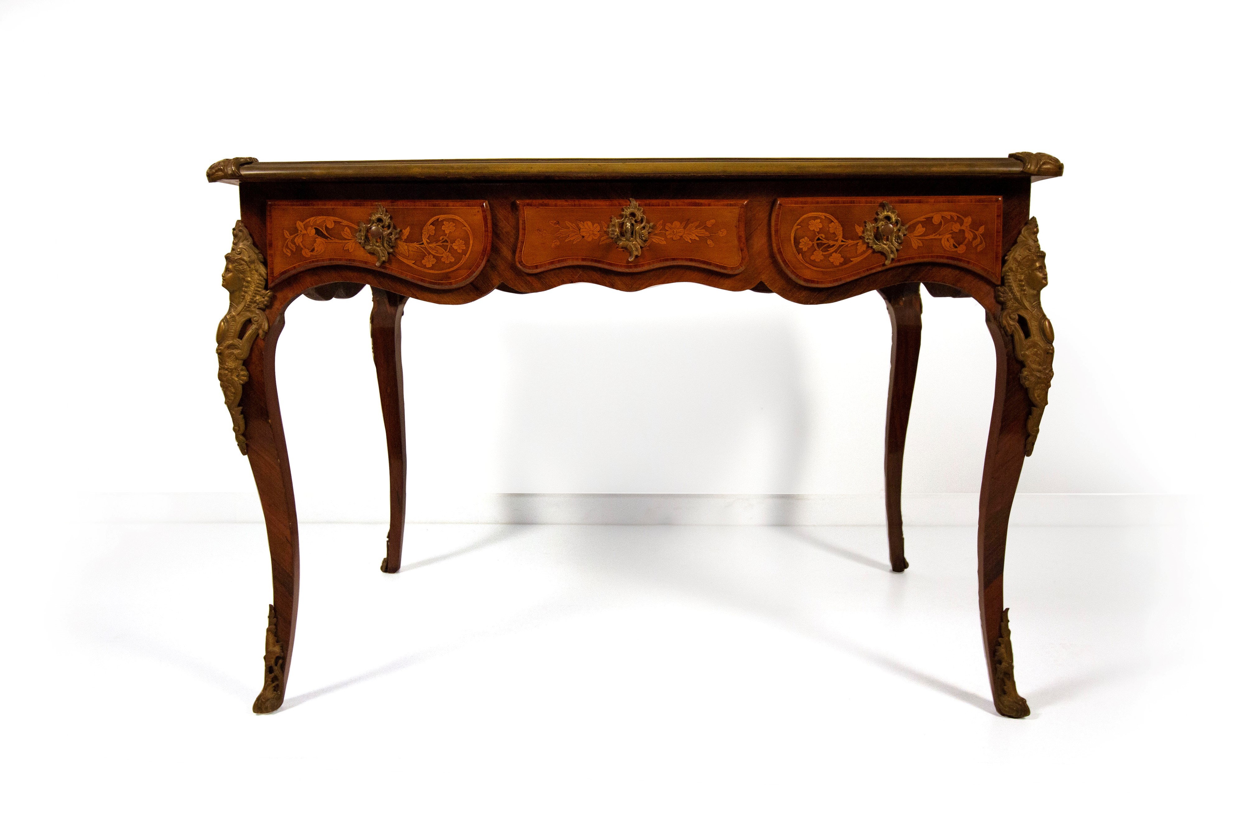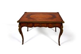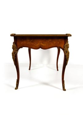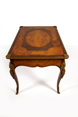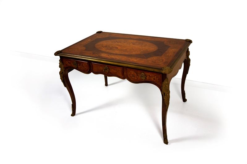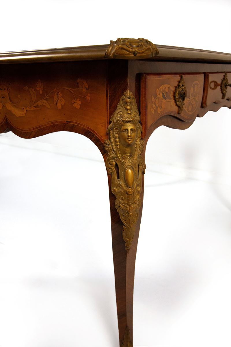 Scrivania intarsiata in legni vari, inizi del XX secolo