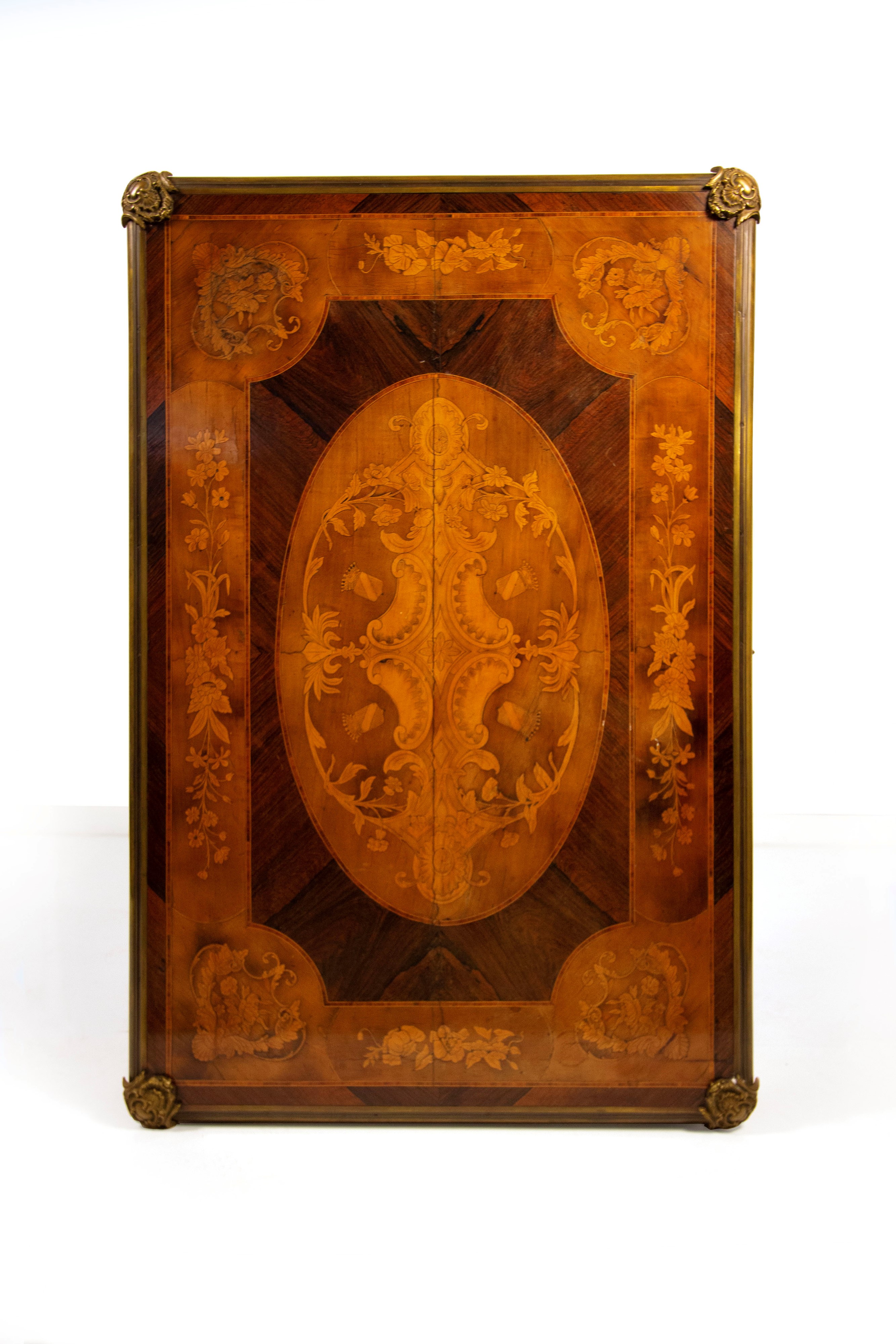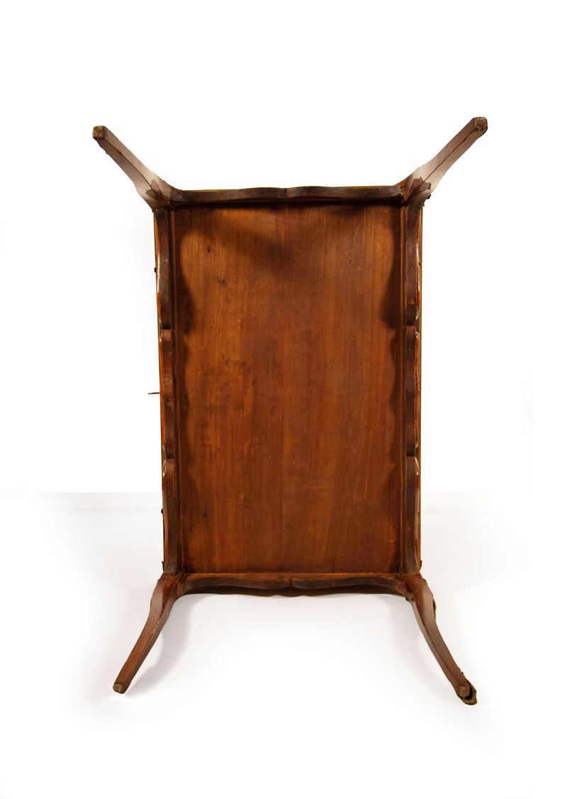 piano decorato da un ovale a centrare riserve con stemmi, nella cornice tralci fioriti. Cintura sagomata a tre cassetti e altrettanti simulati sul lato opposto, piede con scarpette metalliche in bronzo dorato