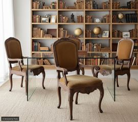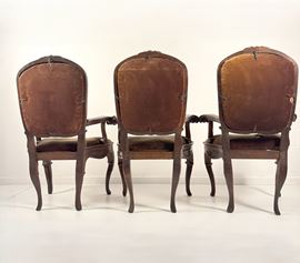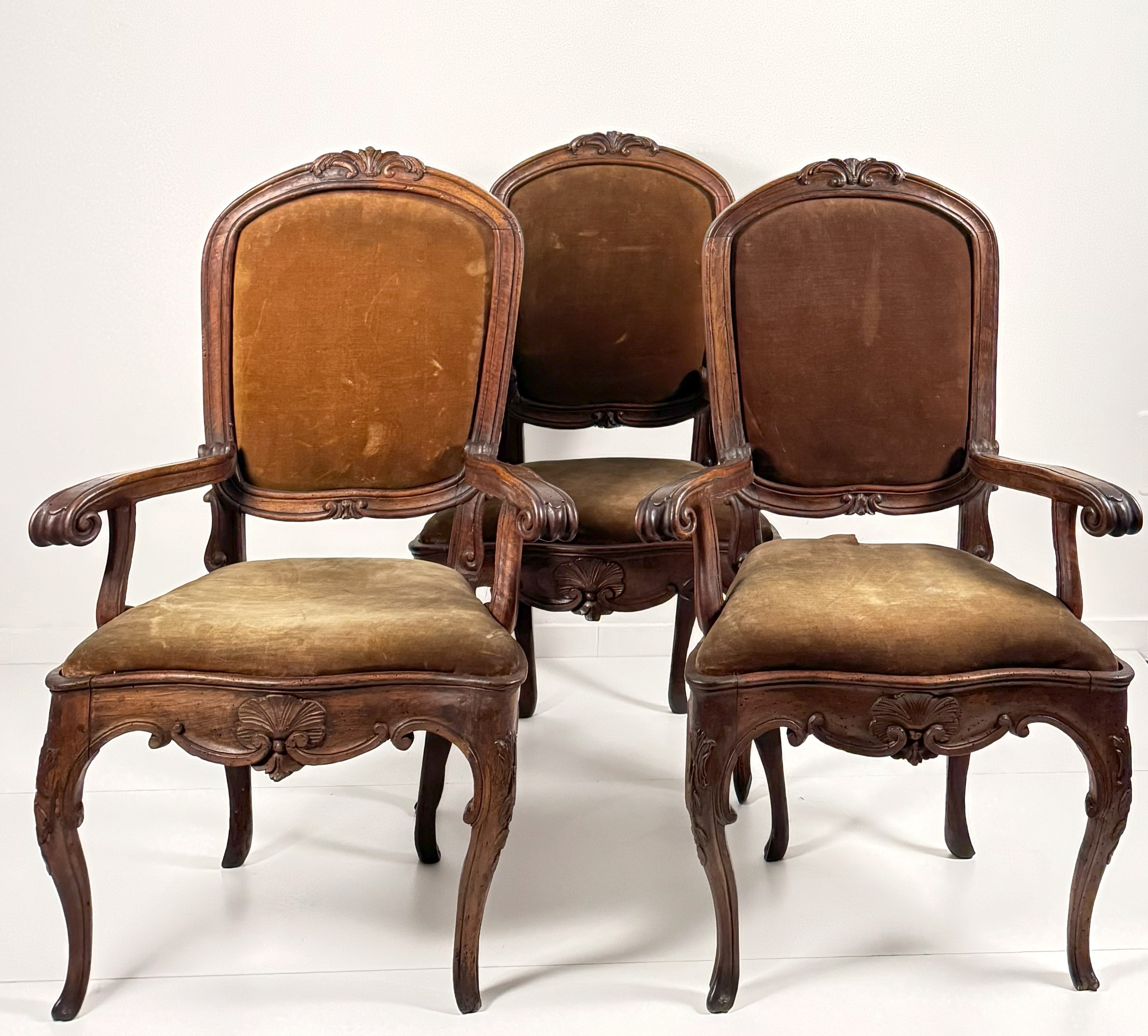 schienale leggermente sagomato con decoro a volute contrapposte, braccioli mossi terminanti a ricciolo, cintura sagomata e scolpita, ornata da un motivo a conchiglia al centro, piccola cascata fogliata sulla gamba mossa, piedi terminanti a ricciolo, schienale e seduta imbottita e rivestita in velluto marrone