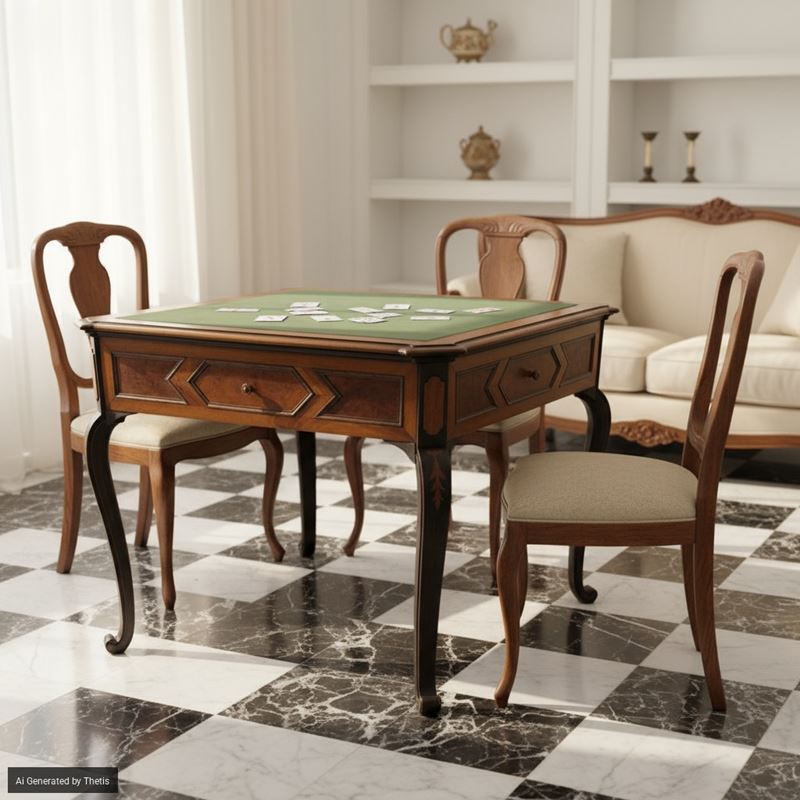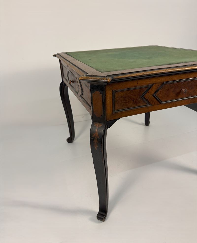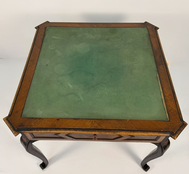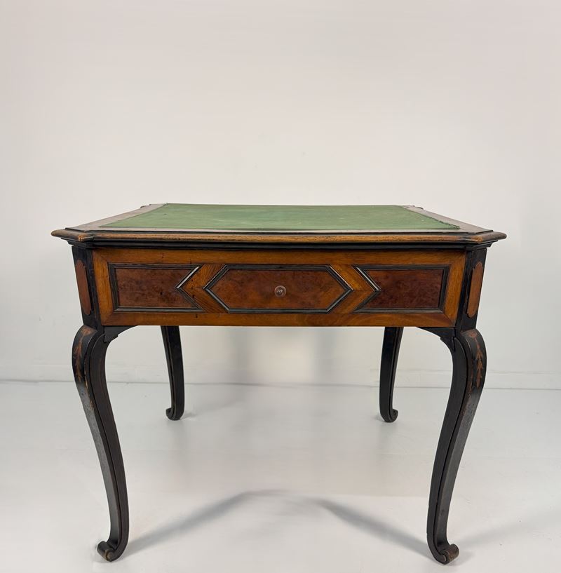 piano rivestito in tessuto verde con angoli smussati, nella fascia un cassetto esagonale in ciascuno dei lati; gambe in legno ebanizzato intarsiato sull'attacco, piedi a ricciolo