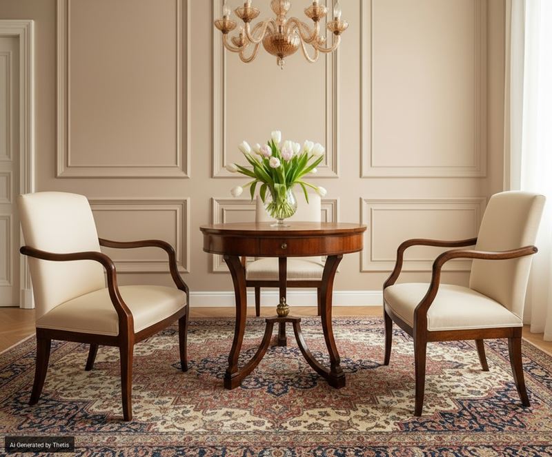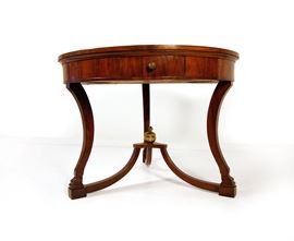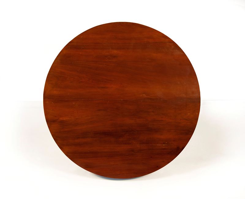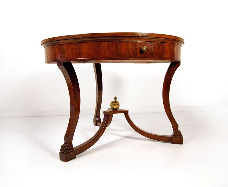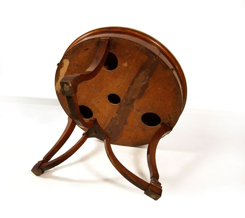 con piano circolare, cintura dritta a due cassetti, tre gambe a sciabola raccordate da traverse sagomate a centrare un pinnacolo in bronzo dorato