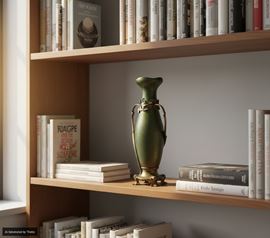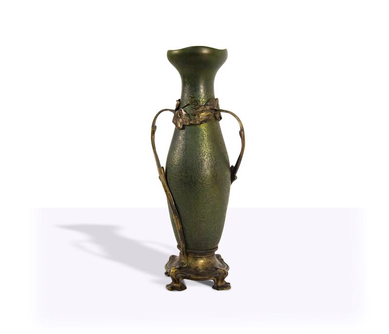piriforme con bocca lievemente svasata è di colore verde iridato ornato da una montatura a tralcio che termina in foglie e poggia su una base quadripode